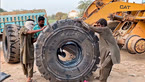 开叉车卸货,货太重车打滑了,只好请钩机支援