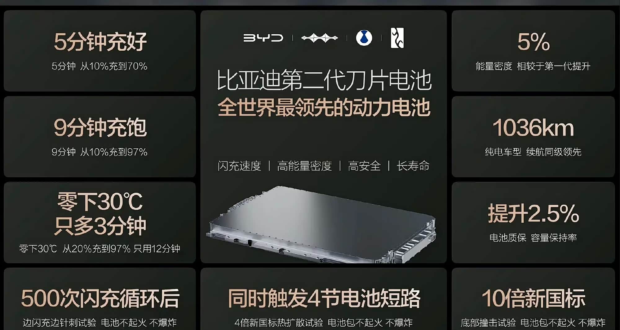 比亚迪第二代刀片电池发布,10%-97%充电只要9分钟 能量密度提升5% 电池质保容量保持率整体提升2.5% 从10%-70%充电时间只要5分钟 从10%-97%充电时间只要9分钟 零下30°C,从20%充到97%只用12分钟 10款首搭车型: 方程豹钛7EV闪充版、2026款海狮06EV、仰望U8 2026款、仰望U8L鼎世版、大唐、全新腾势Z9GT、宋Ultra EV、仰望U7 2026款、方程豹钛3闪充版、海豹07EV。 #比亚迪第二代刀片电池##比亚迪发布二代刀片及闪充#