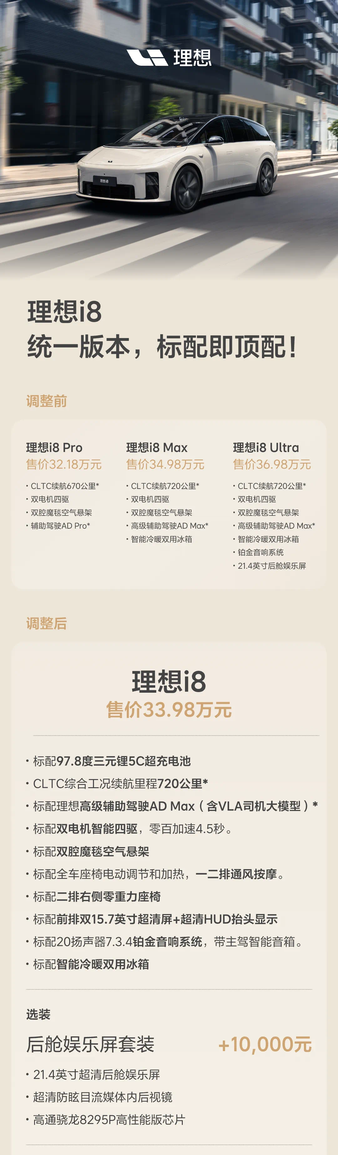 刚写完乐道L90和理想i8的账面对比 理想就调配置调价格了,听劝还是挺好的 价格拉齐 不纠结了 33.98 其它想要什么你自己加 冰箱标配了(对齐乐道L90 第二排零重力座椅标配(对齐乐道L90 双小桌板(比乐道L90多一个 续航也拉齐 统一720 选择变简单 但不选理想的人不一定是因为不好选哦