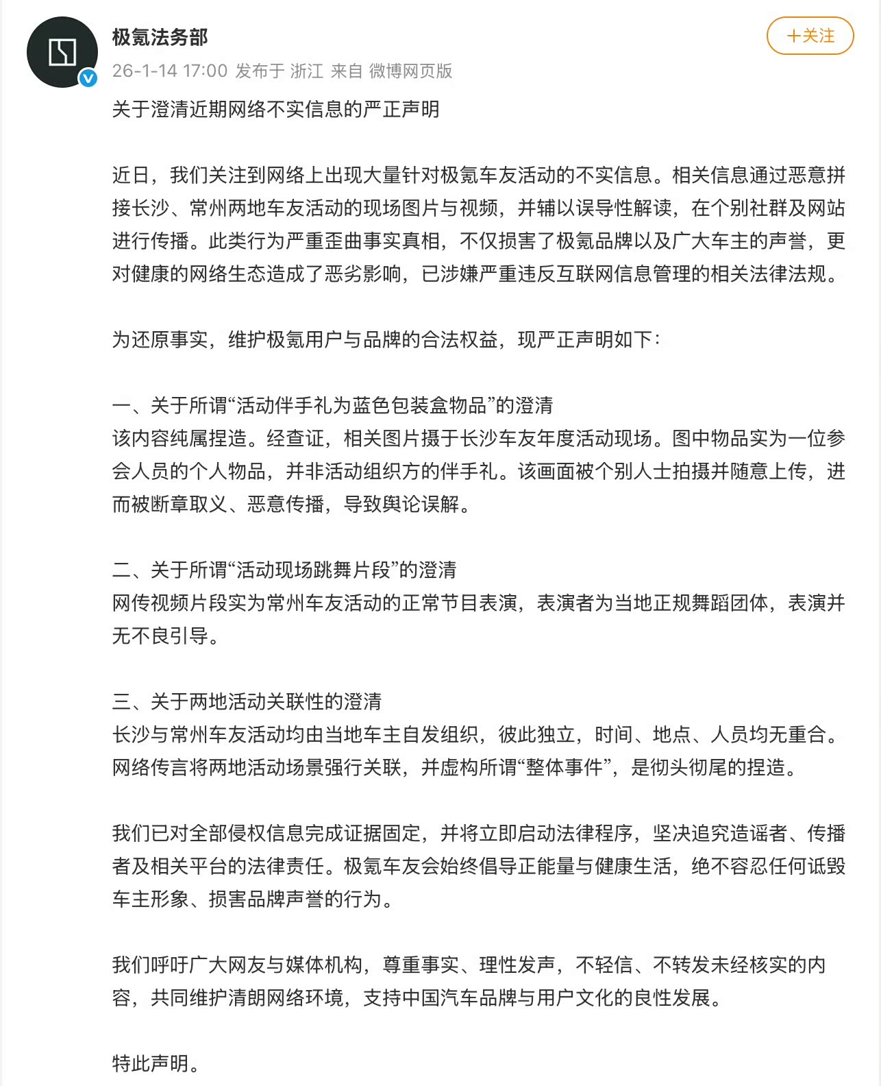 1月14日,极氪法务部就网络上出现大量针对极氪车友活动的不实信息发布声明,声明如下: 一、关于所谓“活动伴手礼为蓝色包装盒物品”的澄清 该内容纯属捏造。经查证,相关图片摄于长沙车友年度活动现场。图中物品实为一位参会人员的个人物品,并非活动组织方的伴手礼。该画面被个别人士拍摄并随意上传,进而被断章取义、恶意传播,导致舆论误解。 二、关于所谓“活动现场跳舞片段”的澄清 网传视频片段实为常州车友活动的正常节目表演,表演者为当地正规舞蹈团体,表演并无不良引导。 三、关于两地活动关联性的澄清 长沙与常州车友活动均由当地车主自发组织,彼此独立,时间、地点、人员均无重合。网络传言将两地活动场景强行关联,并虚构所谓“整体事件”,是彻头彻尾的捏造。 我们已对全部侵权信息完成证据固定,并将立即启动法律程序,坚决追究造谣者、传播者及相关平台的法律责任。极氪车友会始终倡导正能量与健康生活,绝不容忍任何诋毁车主形象、损害品牌声誉的行为。 我们呼吁广大网友与媒体机构,尊重事实、理性发声,不轻信、不转发未经核实的内容,共同维护清朗网络环境,支持中国汽车品牌与用户文化的良性发展。 特此声明。