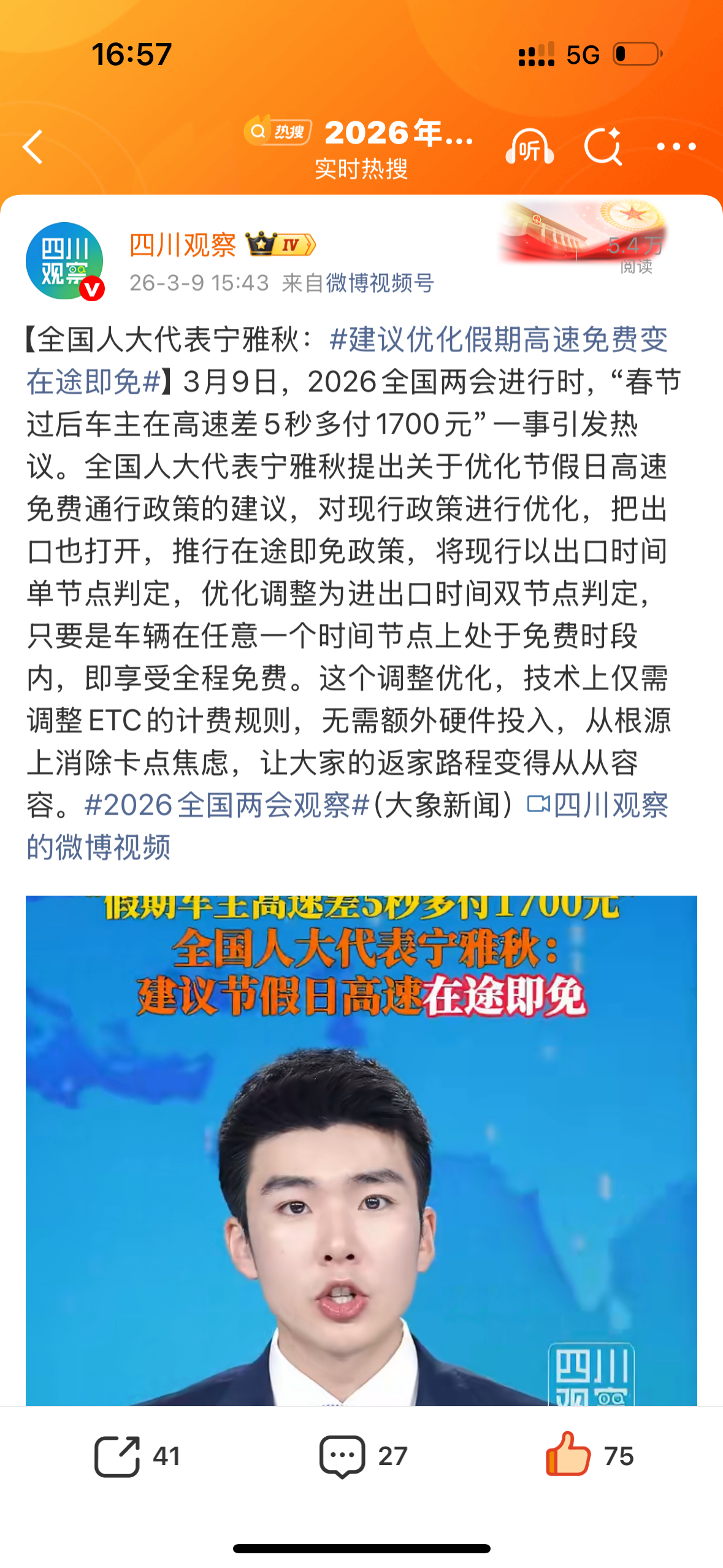 3月9日,2026全国两会进行时,“春节过后车主在高速差5秒多付1700元”一事引发热议。全国人大代表宁雅秋提出关于优化节假日高速免费通行政策的建议,对现行政策进行优化,把出口也打开,推行在途即免政策,将现行以出口时间单节点判定,优化调整为进出口时间双节点判定,只要是车辆在任意一个时间节点上处于免费时段内,即享受全程免费。这个调整优化,技术上仅需调整ETC的计费规则,无需额外硬件投入,从根源上消除卡点焦虑,让大家的返家路程变得从从容容。 来源:四川观察