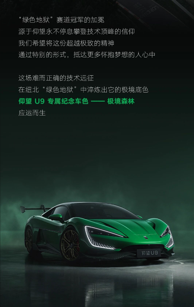 仰望U9推专属车色“极境森林”,真正的纽北绿,为纪念突破纽北电车记录的时刻,今年新车绿色特别多,害得是放在超跑上有范儿昂。现在仰望U9有紫色、红色、银色三种外观颜色,售价都是180万,这次的绿色选装价格为8万,外观5万、内饰3万,价格去到了188万,来张实车图,老板们瞅瞅和海报的区别。