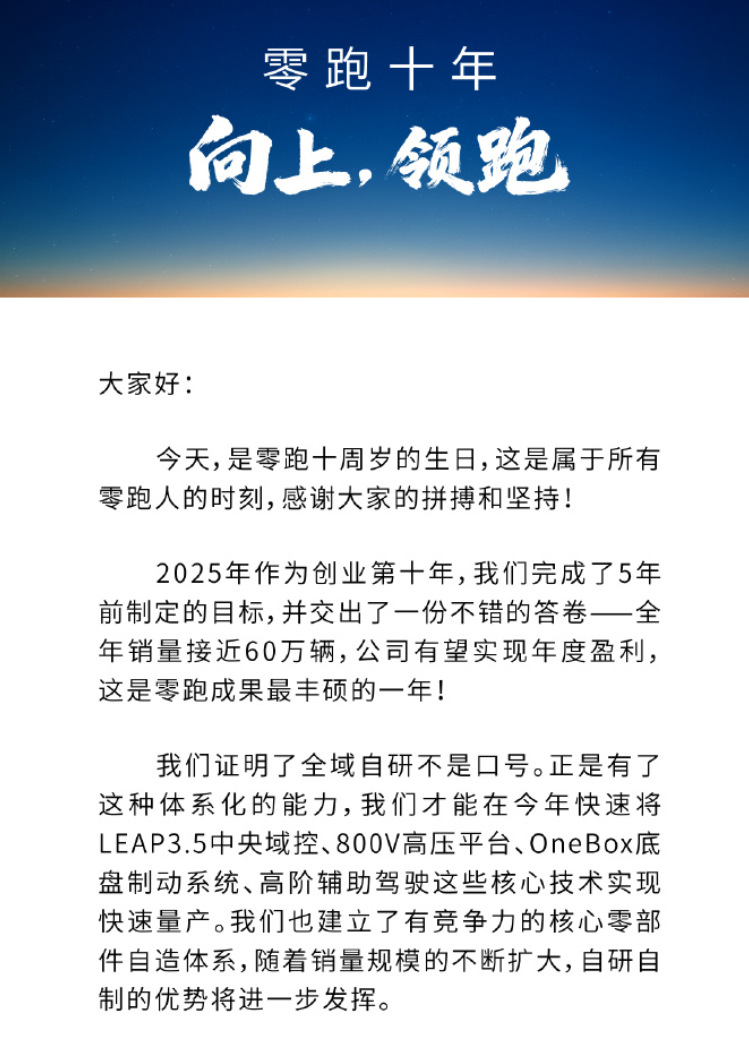 今天是零跑十岁生日,看完朱总的内部信,内心挺有感触,十年前的零跑在众多新势力里不算出彩,但是坚持自研,闷声干实事儿,底气是越来越足了。 有啥事销量说话,2025年卖出近60万辆,C10、B10、B01都挺火,海外市场也很稳,门店超800家,海外交付破6万。 十年磨一剑,之后的路还很长,2026年零跑目标向百万销量看齐,D19、A10等新车会加入,外加研发人员超80%、已建和在建工厂29个,零跑想表达的意思,未来的路自己做主。