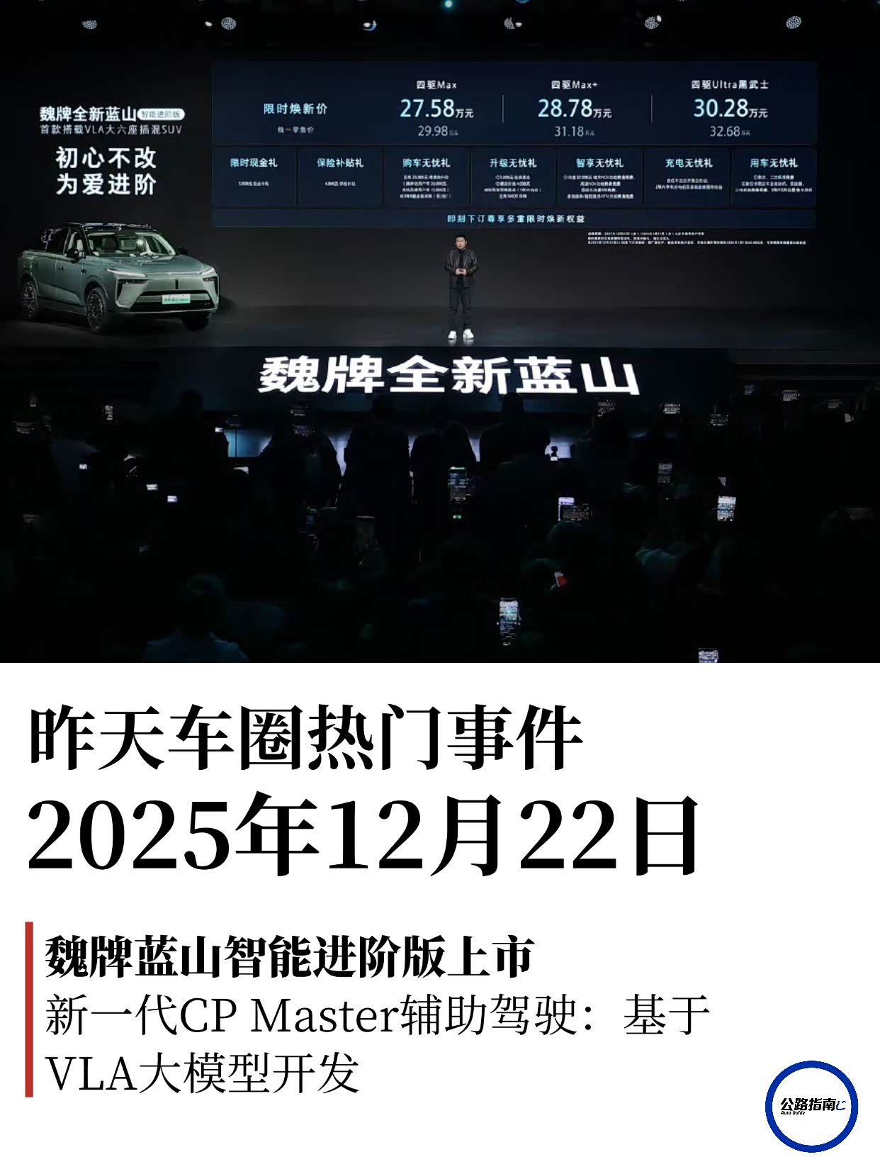 魏牌蓝山智能进阶版上市,售价29.98-32.68万,搭载Thor-U芯片、27个感知元件、VLA大模型、CP Master智驾系统,1.5T+P4电机,综合功率422kW,纯电续航185/220km,综合续航最高1343km;