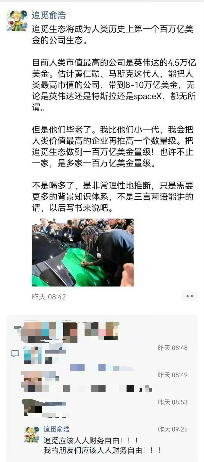 近日,追觅科技创始人兼CEO俞浩发朋友圈表示,追觅生态将成为人类历史上第一个百万亿美金的公司生态。 俞浩提到,目前人类市值最高的公司是英伟达的4.5万亿美金。他预测,黄仁勋、马斯克这代企业家,能把人类最高市值的公司带到8-10万亿美金,无论是英伟达还是特斯拉还是spaceX,都无所谓。 同时他表示,自己比这一代企业家年轻,将把人类价值最高的企业再推高一个数量级。把追觅生态做到一百万亿美金量级。也许不止家,是多家一百万亿美金量级。 俞浩强调,这一判断非常理性,并非酒后之言,具体逻辑以后写书来说。 公开信息显示,追觅科技成立于2017年,核心业务涵盖智能清洁电器,2025年预计营收突破150亿元,同比增长72.2%,前三季度净利润达10.4亿元。 近年来,追觅科技加速跨界扩张,已涉足大家电、无人机领域,2025年官宣造车,2026年1月6日,这款追觅跑车正式揭开面纱,其首款量产车型计划于2027年正式上市。(来源:鞭牛士)
