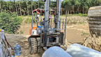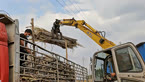 开叉车卸货,货太重车打滑了,只好请钩机支援