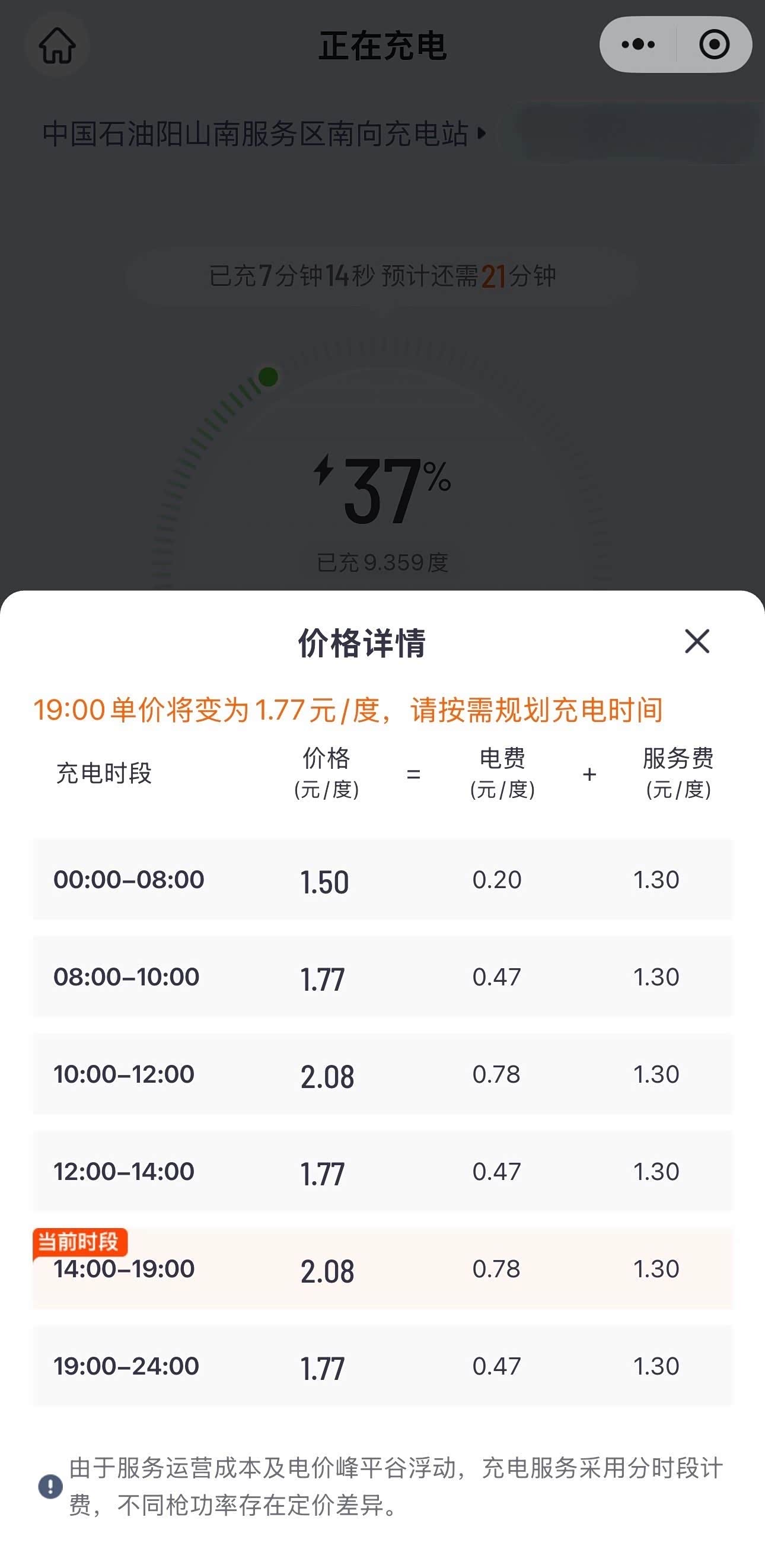 跑了一路高速,在阳山南服务区补能,这账单直接刷新我春节充电的认知底线。 当前14:00-19:00时段,综合电价2.08元/度,看似电费0.78元/度还算常规,可服务费高达1.30元/度,占比超62%!凌晨档更夸张,电费仅0.20元,服务费依旧1.30元,妥妥的“服务费碾压电费”。 充7分钟进账9.359度电,按2.08元/度算,光服务费就占了近12元,这可能是我春节期间充电服务费最贵的一次充电了。春节高速补能溢价能理解,但服务费定价比电费高近两倍,这种“基础电费做幌子,服务费漫天涨”的操作,谁能解释一下什么情况?