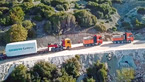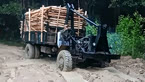 下雨天土路运木材的货车,在泥泞的道路上,一路行驶一路打滑