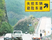 长大下坡制动失效 【应急处置措施】 在行驶过程中出现行车制动器失效时,驾驶员可采取以下应急处置措施: (1)握稳转向盘,控制车辆的行驶方向,松抬加速踏板。 (2)抢挂低速挡控制车速,拉紧驻车制动器操纵杆。切记过猛拉紧驻车制动器操纵杆,应逐步控制车速。若有条件,可利用发动机排气制动、缓速器等辅助制动装置减速,避免过多使用行车制动器。 (3)观察车辆周围交通状况,开启危险报警闪光灯、交替变换远近光灯或鸣喇叭发出警示信号。 (4)观察行车道路条件和地形地貌,利用障碍物或选择岩壁、道路边沟迫使车辆降速停车,以求减小损失。若有避险车道应选择驶入避险车道停车。 小贴士 避险车道的作用:避险车道是一条“救命道”,是专门为减慢失控车辆速度并使车辆安全停车设置的辅助车道。避险车道是上坡车道,表面为铺满沙石或松软沙砾的制动层,两边有护栏,路端有沙石坑或者铺满轮胎的防撞墙壁,并且连接着主车道。当车辆在行驶中突然制动失效或无法控制行驶速度时,可以开往避险车道应急避险。