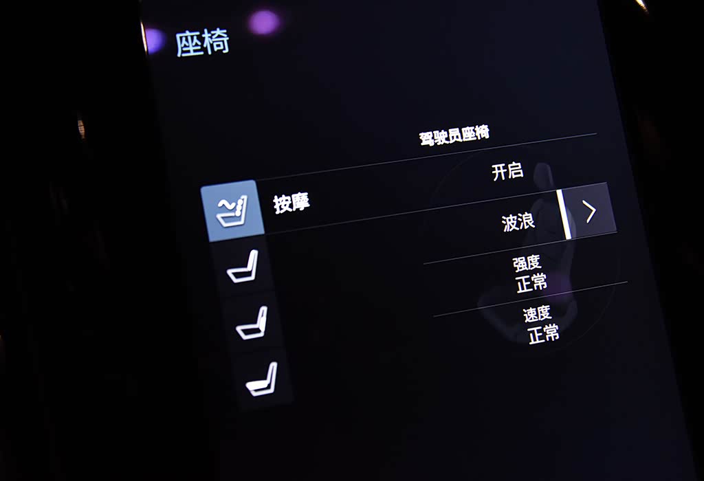 前排座椅看上去有些很薄,实际坐着倒还可以,80分的水平;功能特别之处在于提供侧向包裹电动调节、座垫长度延伸以及座椅按摩(主副驾都有),很齐全。几天里我的用车顺序变成了:着车、开按摩(调整到最强力度),选音乐,让音响效果默认为哥德堡音乐厅模式,最后再打开负离子发生器。好了,可以享受沃尔沃的驾驶乐趣了……
