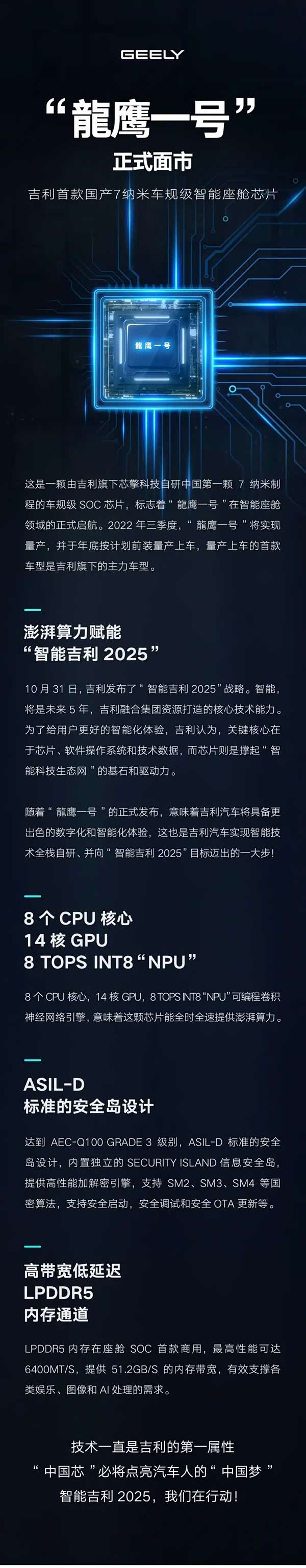 官方介绍这是一颗由旗下芯擎科技自研中国第一颗7纳米制程车规级SoC芯片,标志着“龍鹰一号”在智能座舱领域正式启航。“龍鹰一号”将于2022年三季度实现量产,并于年底按计划前装量产上车,量产上车的首款车型是吉利旗下的主力车型。
