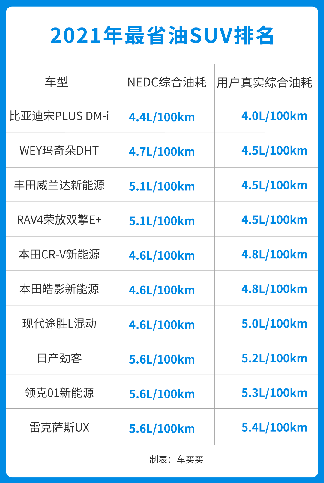 鉴于广大消费者对于油耗如此看重,买买君今天为大家盘点2021年最省油的几款SUV,以便大家在购车时能做出更好的选择。值得一提的是,今年不同于往年,以往最省油SUV基本被日系品牌包揽,但随着中国自主品牌在混合动力领域的崛起,涌现出不少节油SUV,成为广大消费者的首选。