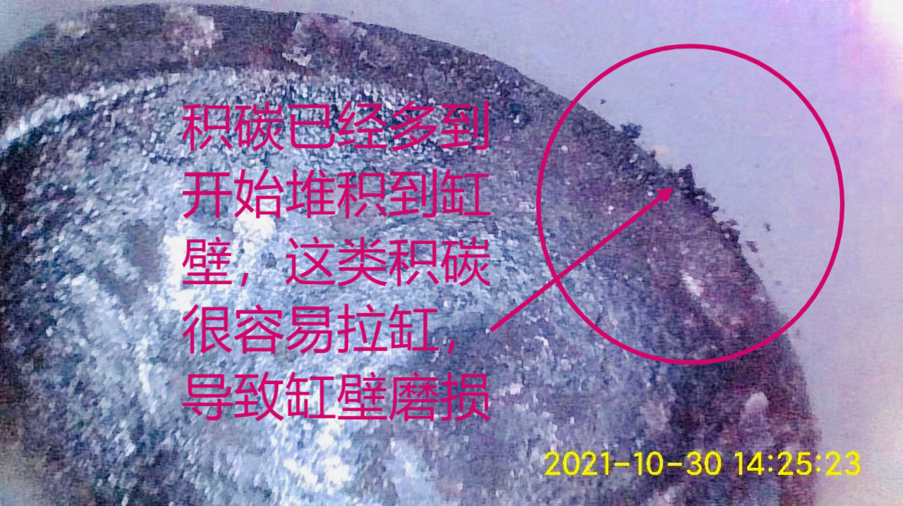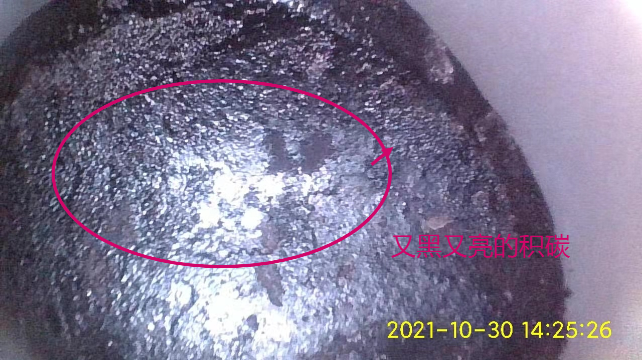 2.活塞顶部的积碳超厚,黑亮,说明积碳生成时间很长,一层层覆盖导致又黑又亮