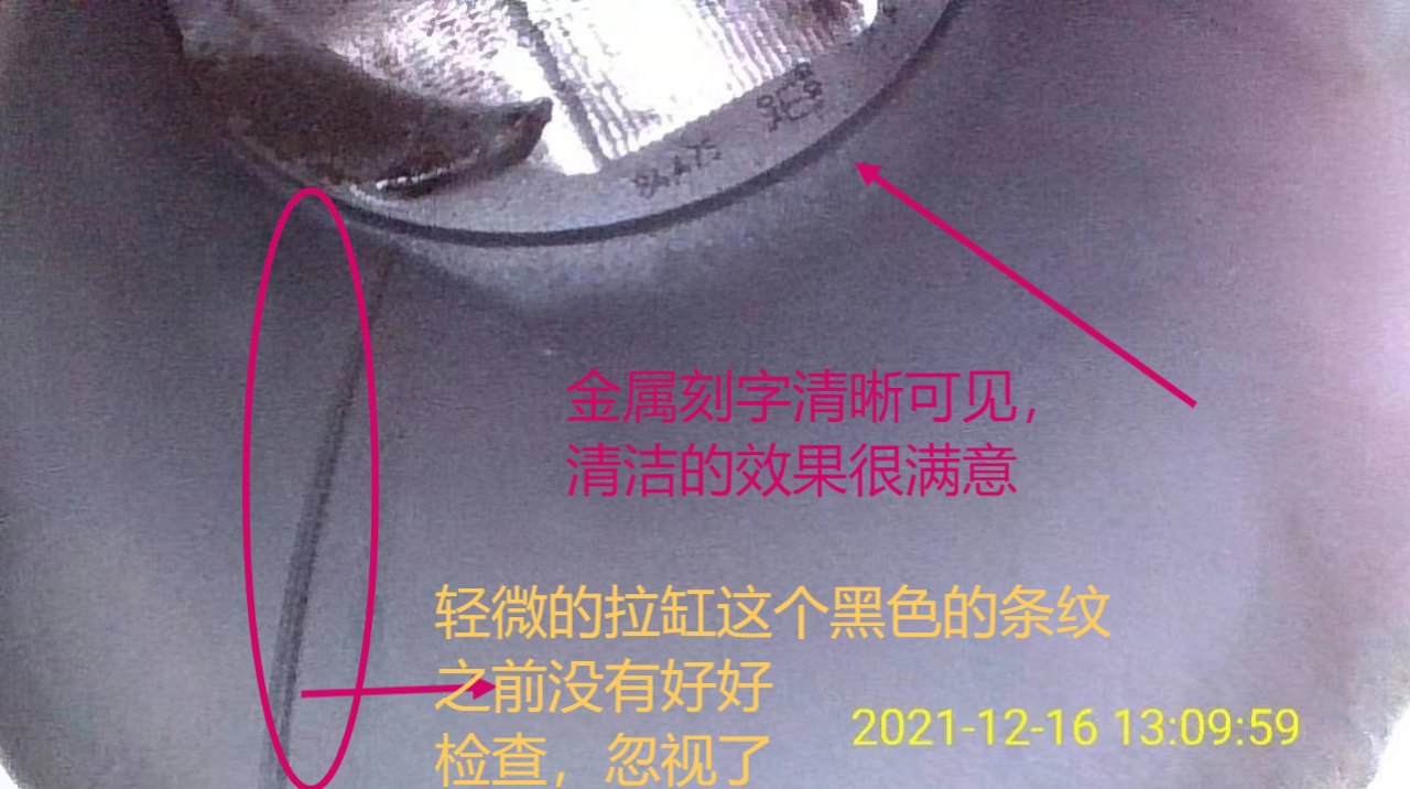 金属刻字清晰可见,清洁的效果是很满意,但是有拉缸,只是我自己之前的疏忽,没有好好检查。