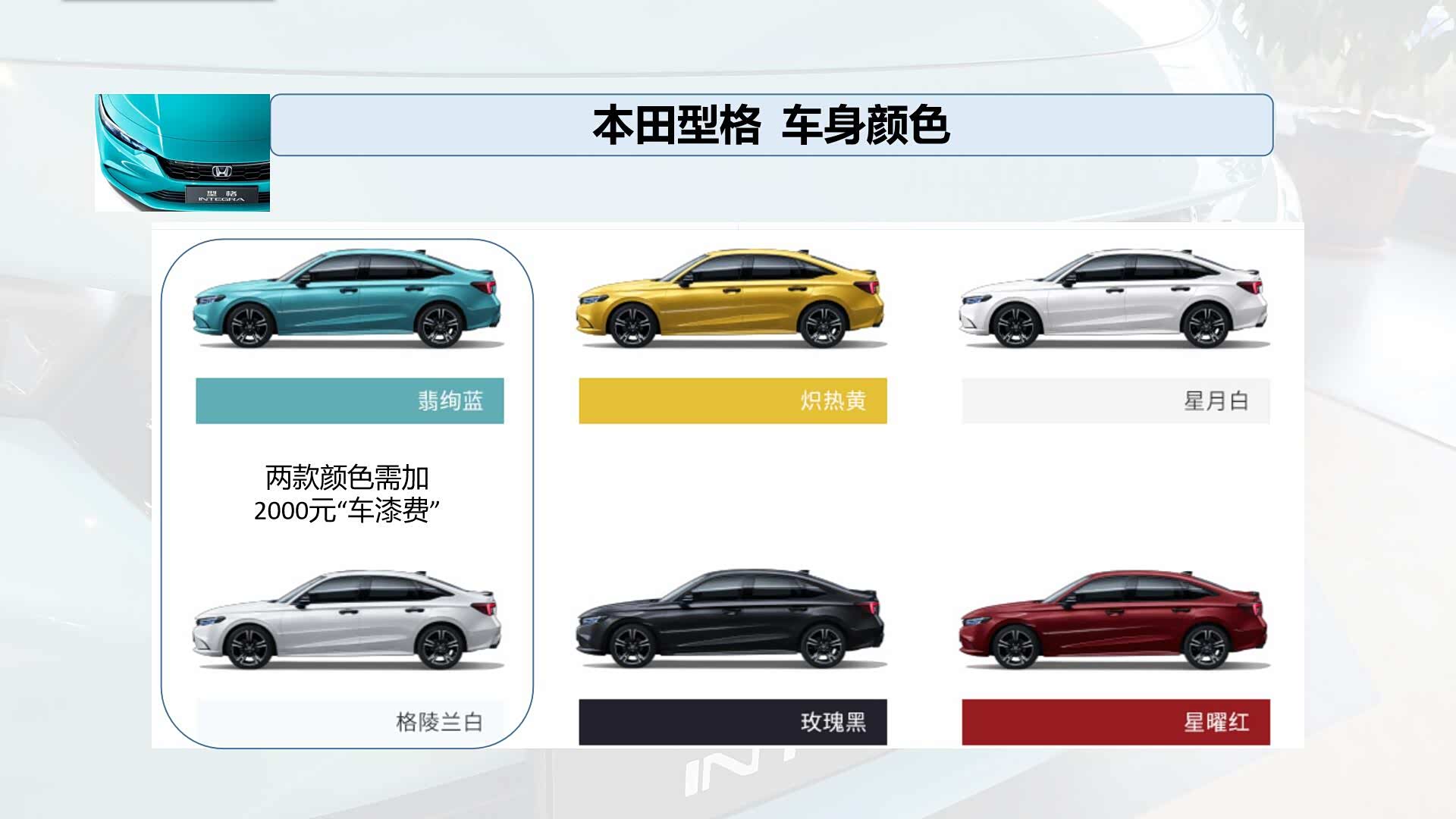 车身颜色方面,本田型格提供了翡绚蓝、炽热黄、星月白、格陵兰白、玫瑰黑、星耀红六款车身颜色。其中翡绚蓝颜色只搭载在幻夜版车型上面,并且这款颜色和格陵兰白则需要增加2000元的“车漆费”。