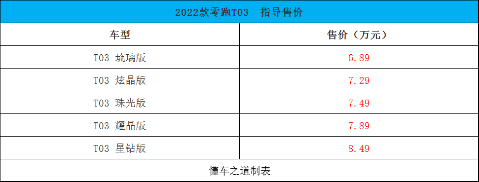 【懂车之道 新车】12月28日,2022款 零跑T03(参数|询价)正式上市,新车提供5款车型供消费者选择,补贴后售价区间为6.89-8.49万元,新车定位为一款微型电动车,新车属于升级改款,新款零跑T03搭载最大功率为80kW(109马力)的永磁同步电机,NEDC续航里程为301km和403km。