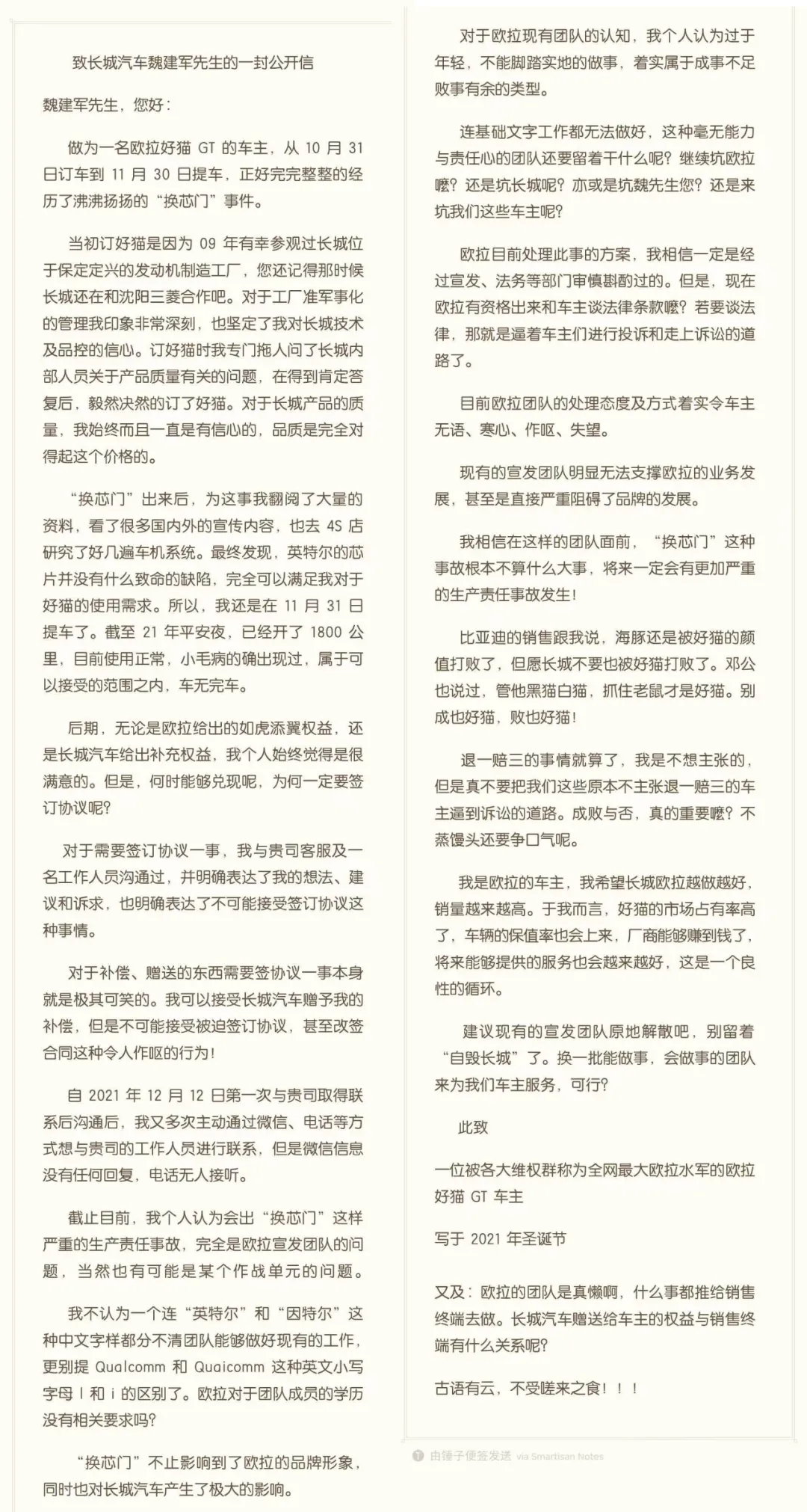 蓝牙门发生的同时,一位忠粉车主给魏建军的致信近日也在各个好猫车主群中广泛传播。
