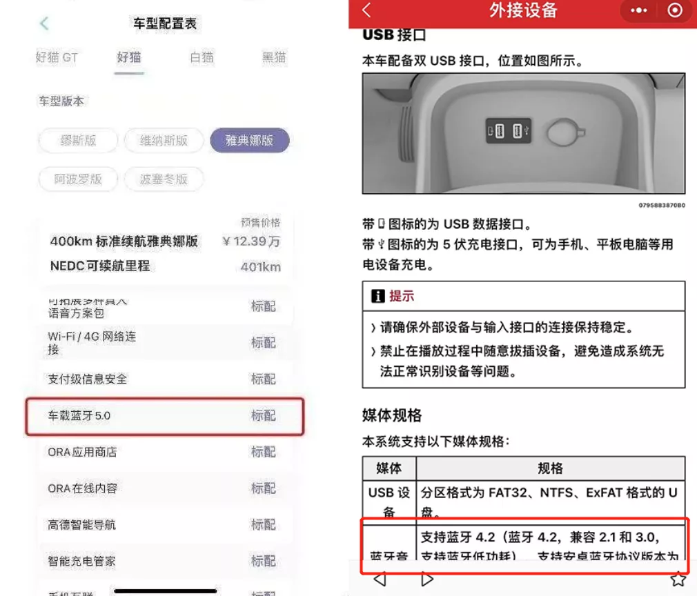 此前,好猫配置表中显示全系标配蓝牙5.0协议。但近日,一些车主在用车手册以及车机信息中发现,好猫实际使用的是蓝牙4.2协议。