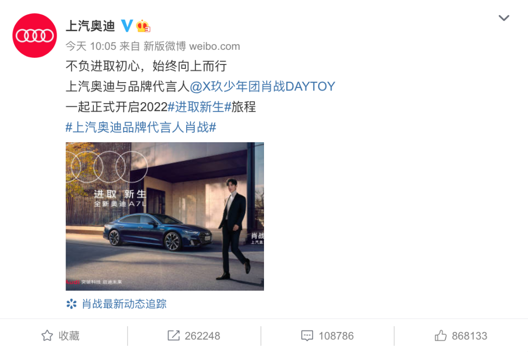 2022年第一天,肖战空降官宣商务代言,成为上汽 奥迪A7L(参数|询价)的品牌代言人。今日,上汽奥迪官方微博发布消息,官宣肖战为上汽奥迪品牌代言人。