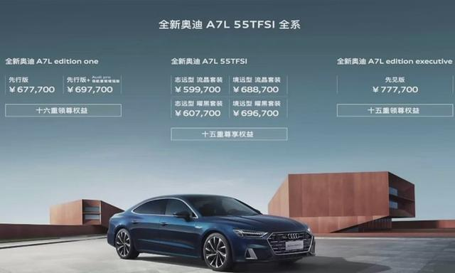 汽车行业关注在去年9月份曾报道,A7L是上汽奥迪首款量产车型,售价为59.97-77.77万元。其中,先行版共推出两款车,售价为67.77-69.77万元;55TFSI共推出两款车型,售价为59.97-69.67万元。与此同时,奥迪A7L也推出了一款先见版车型,售价为77.77万元。