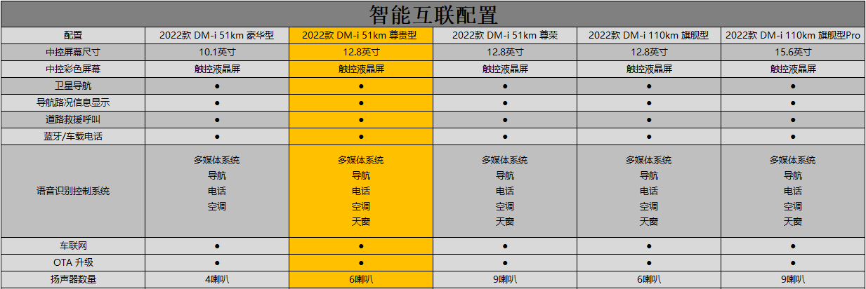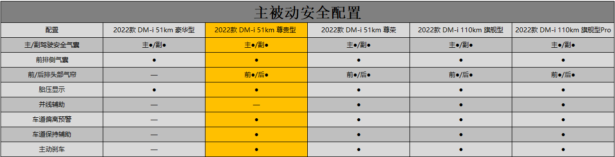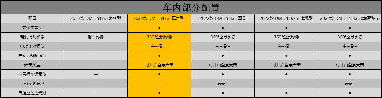 整个车系的顶配110km旗舰型 Pro在配置上几乎与51km尊荣型一致,而动力续航与110km旗舰型一致,价格相比51km尊贵型提升了1.8万元,也并不是很有必要。所以综合对比之下,DM-i 51km 尊贵型是最值得购买的车型。