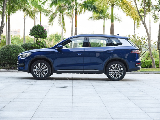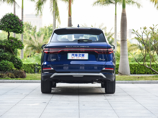 车身侧面的造型与老款车型相差不大,比亚迪特色性的腰线得以保留,使得整个车侧的层次感十分突出。而且车尾部的D柱采用了与B柱、C柱相同的熏黑设计,呈现出悬浮式车顶的视觉效果。除最入门款车型外,其余车型都配备有车顶行李架,使整台车的实用性和运动感都有提升。顶配车型将配备19英寸的轮毂,其他车型则配备18英寸的轮毂,给人的整体感觉比较雄壮。