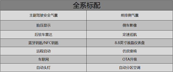 我们先来看看售价为13.48万元的入门款51km豪华型,8.8英寸的液晶仪表盘、后倒车雷达、蓝牙、NFC钥匙、远程启动、车联网、OTA升级、全车仿皮座椅、自动分区空调等刚需配置和科技化配置都有配备,但是由于入门定位的原因,在舒适性配置和提升驾乘体验的享受性配置上有所欠缺。所以想要得到更好的舒适化驾乘体验,还是得看高一级的51km尊贵型。
