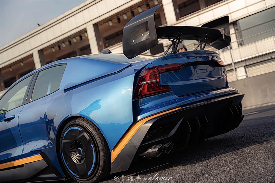来到尾部,硕大的尾翼会第一时间成为视觉中心,碳纤维材料的加持,性能范儿十足。作为一台赛化改装车,双边共四出的排气肯定是要配备的,但由于这台基于沃尔沃S60 T8车型打造,并且没有进行动力部分的改装,所以车辆点火之后,先是电机介入,所以没能听到这台车声浪。