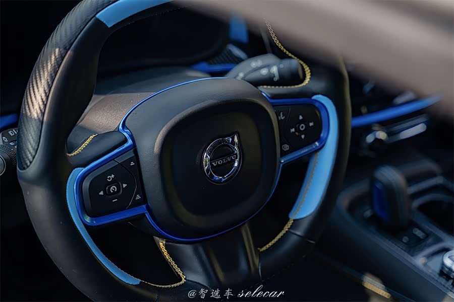 外观进行了赛化改装,内饰肯定也不能落下。为了与外观颜色相匹配,内饰部分也是用了蓝色、黄色进行点缀。同时,原厂的前排座椅也被拆掉了,换了赛用桶椅,而方向盘的样式也做了调整,蓝色皮质加上金属质感的边框,辅以黄色缝线和碳纤维材料,气质这一块可以说把握得非常到位。