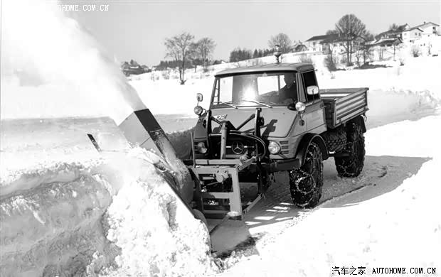 说回这篇文章的主角-乌尼莫克406系列,406系列在60年代推出时拥有无可比拟的强大性能,低速加力档,超长的悬挂行程,防弹的传动系统和先进的助力转向系统都让406系列成为了当时最强大的越野机器。而前后多个PTO(机具动力输出口)输出位的设计也让406系列成为了非常全面的多用途车辆(下图为乌尼莫克406配合雪铲)。