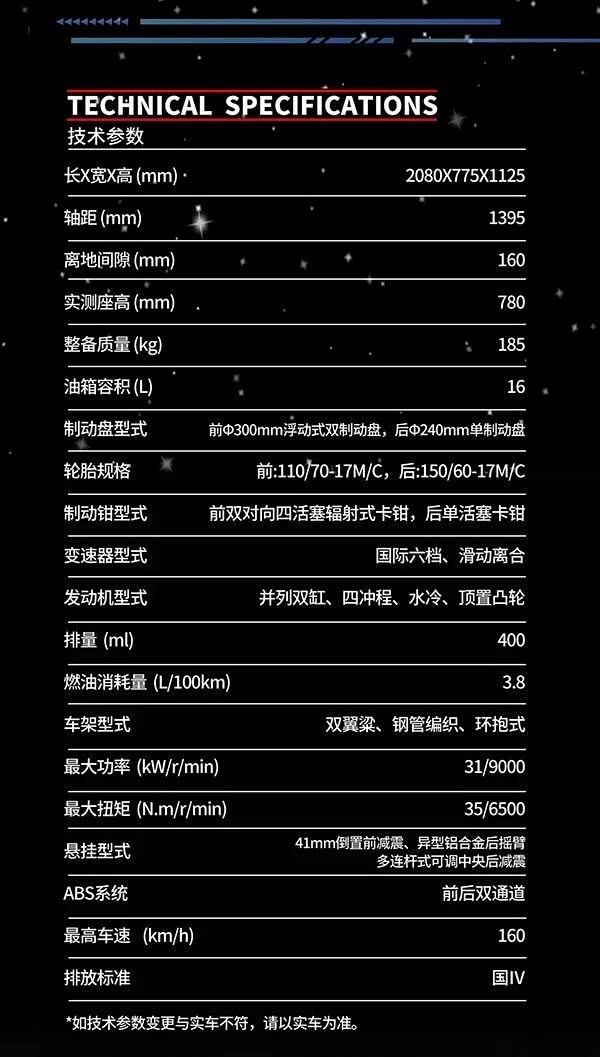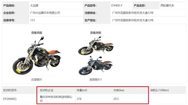 从工信部申报数据来看,大运食铁兽配备的是一台由宗申提供的TC380双缸发动机,最大功率29.5kw,不过官方给出的参数表上是31kw/35Nm,似乎比赛科龙RE3(380)的数据要强那么一些,185kg的整备重量也跟RE3相差无几。