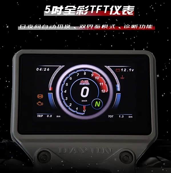 5寸的全彩TFT仪表,提供日间、夜间两种显示模式,仪表盘的内部设计也很规整,所需要的数据一应俱全,除了一些核心基本数据之外,还包括挡显、电压。