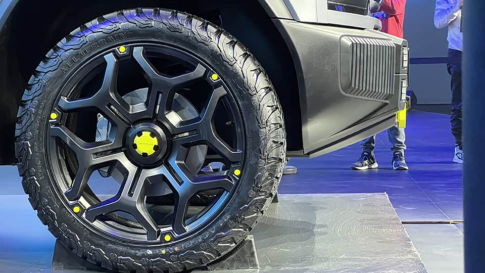 在其他概念车的细节上,捷途T-X展示着优秀的通过性硬件底子。22寸轮毂,配备AT胎。通过轮胎和轮眉的间隙来看,它拥有比较长的悬挂行程。且根据我们在现场对车辆的观察,它的接近角和离去角够大,离地间隙也超过了200毫米。综合来看,车辆的通过性表现应该还是符合我们对一台硬派SUV的期待的。但是由于限制,无法近距离观察车辆,我们暂时很难判断这款车采用的什么类型的悬挂结构。