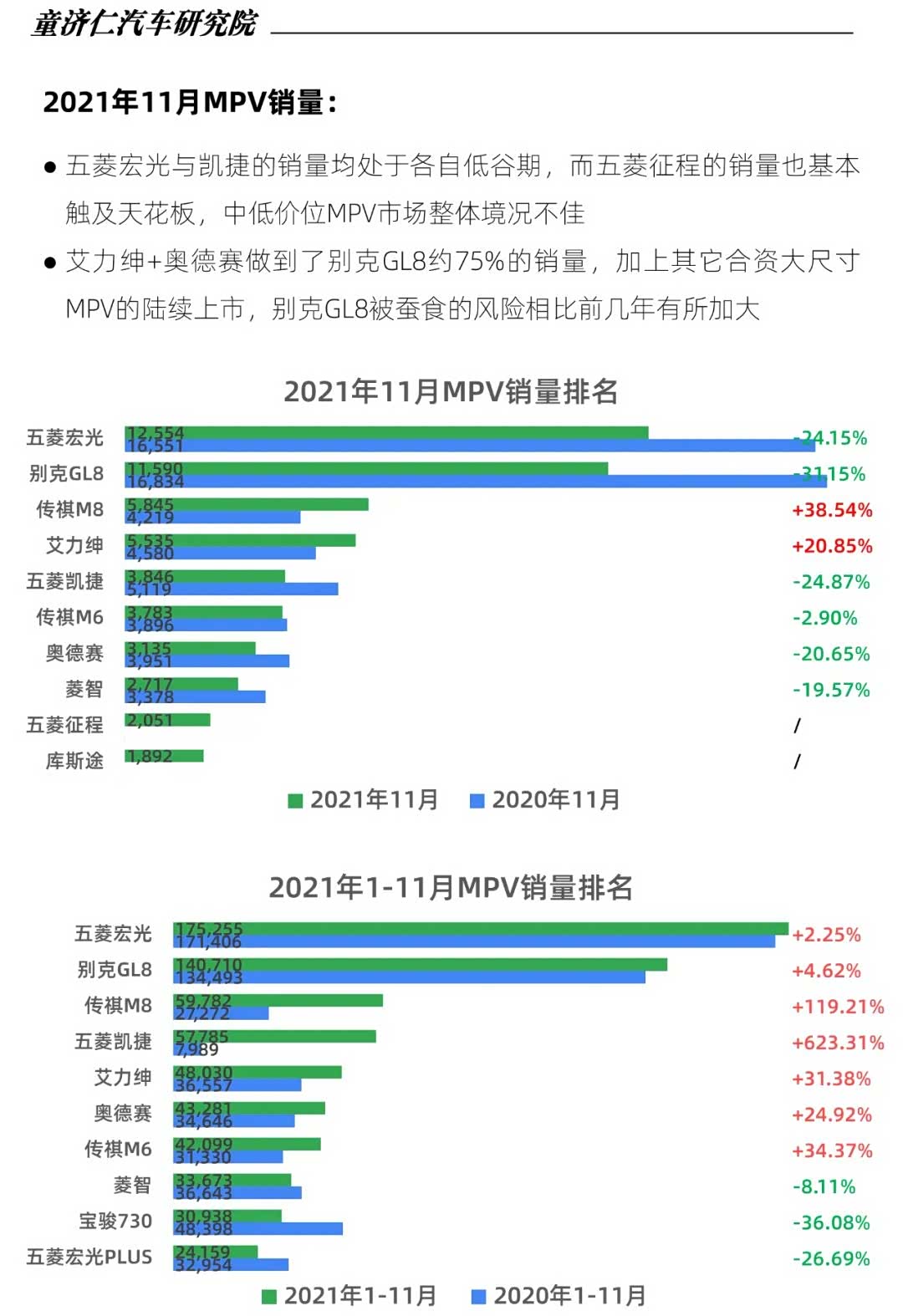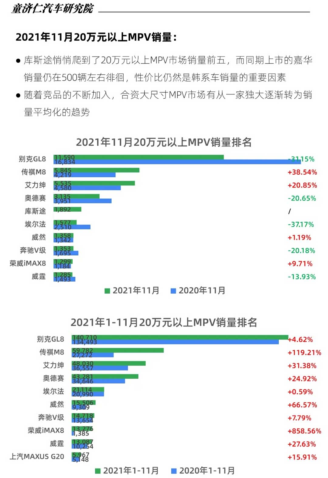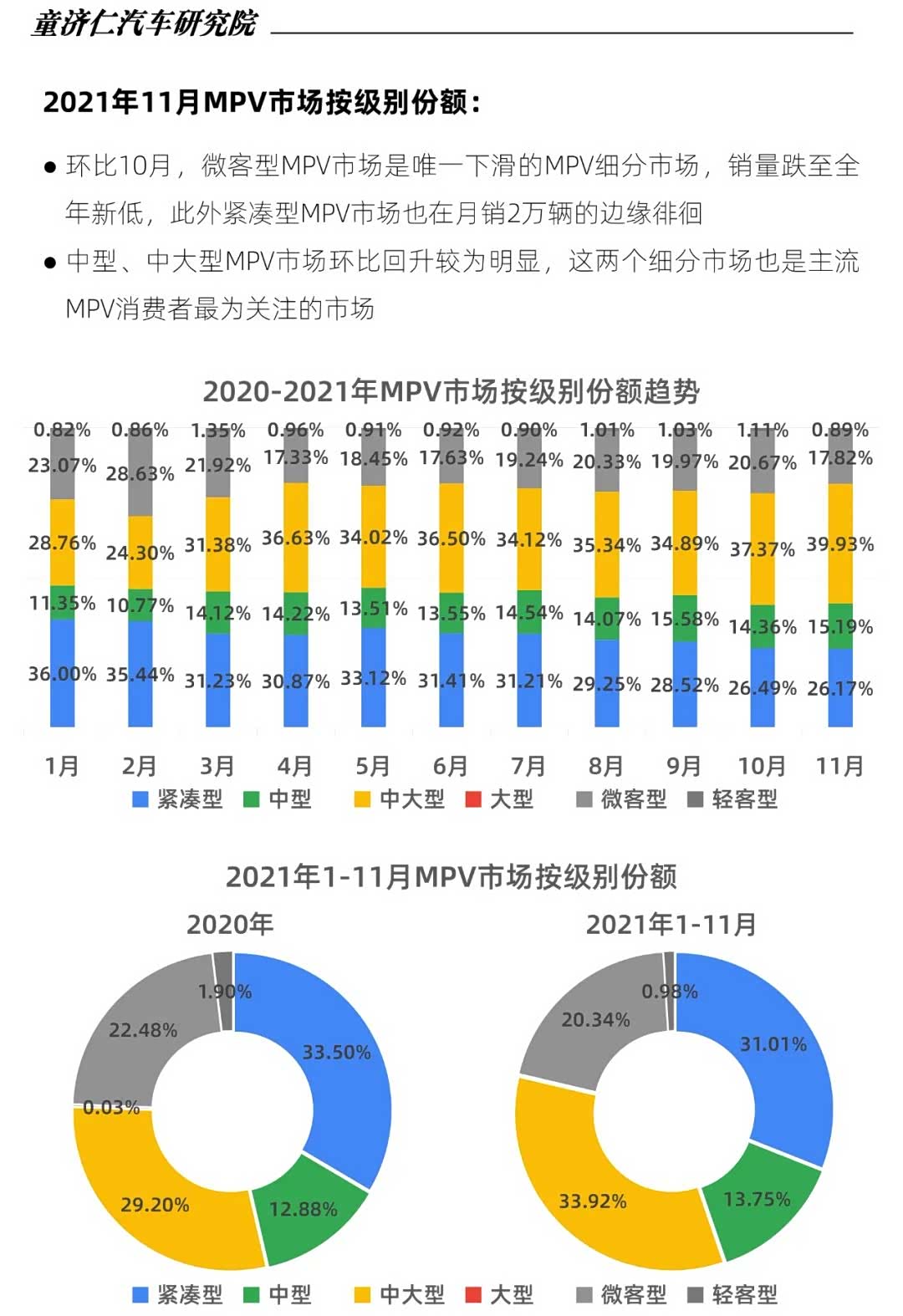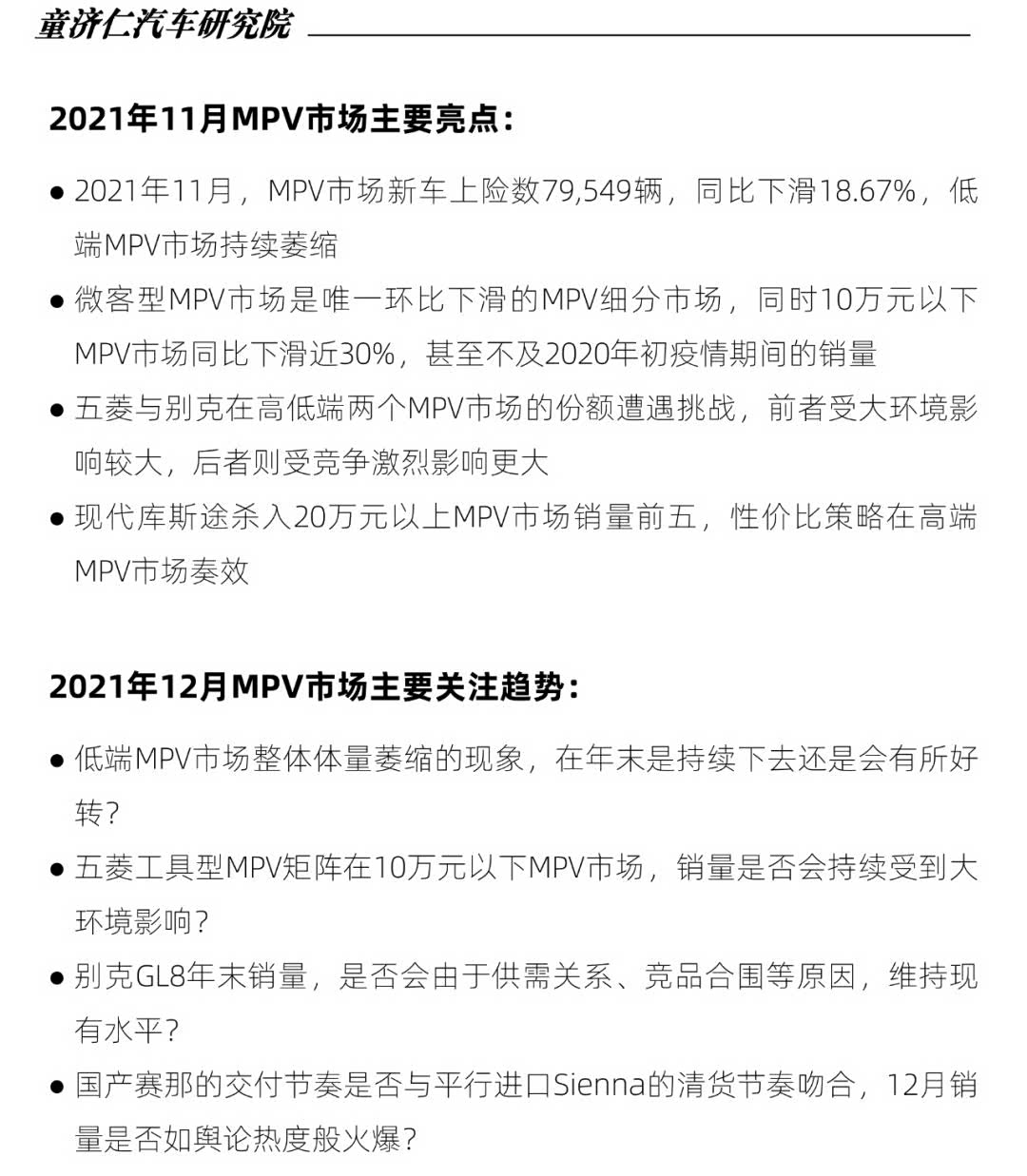 比如奥德赛和艾力绅改款之后,整体产品力针对家用人群的需求有较大提升,在30万元左右的家用市场有了更强的竞争力,而这个价格段恰好又是GL8陆上公务舱和ES陆尊之间最薄弱的市场。11月奥德赛与艾力绅销量总和已经达到了GL8约75%的水平。同时,赛那会在更高价位与GL8陆尊甚至艾维亚正面争夺高端家用消费者。