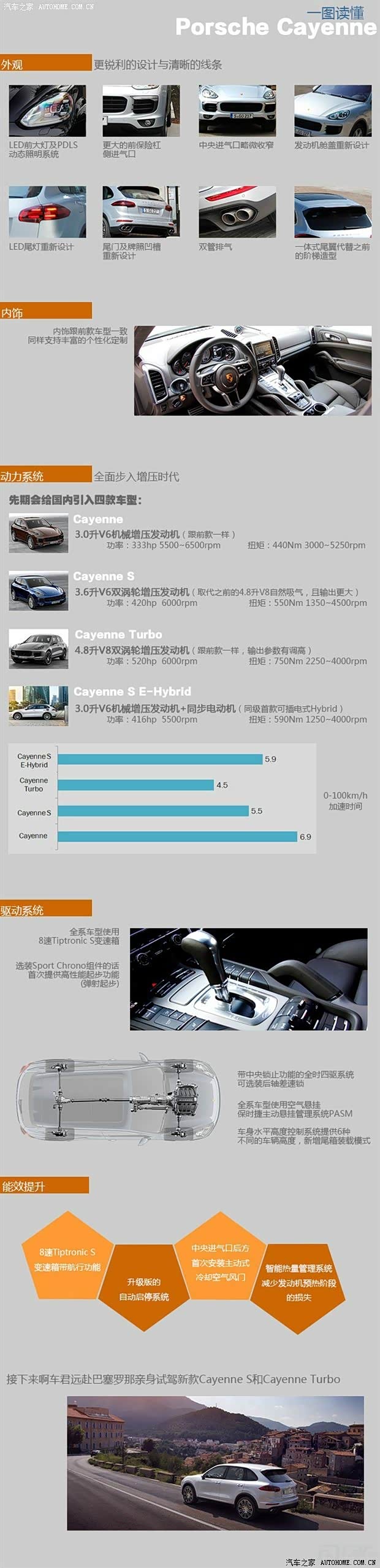 至于内在的提升就主要集中于动力系统上面。国内市场先期会推出4款车型,入门的Cayenne依然搭载3.0升V6机械增压发动机,Cayenne S不再使用4.8升V8机器了,转为3.6升V6双涡轮增压发动机,至于Cayenne Turbo则依旧采用4.8升V8双涡轮增压发动机。