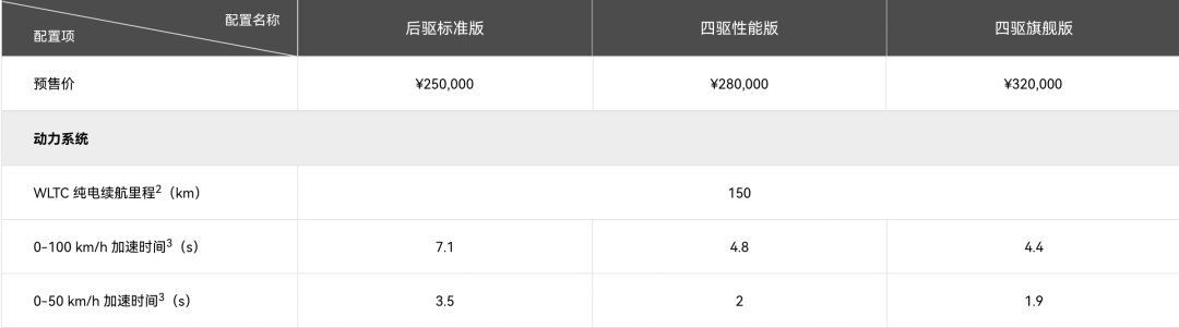 是的,原本赛力斯SF5两个版本的售价分别是21.68万元和24.68万元,如今问界M5预售价则是定在了25~32万元,其中25万元的标准版为单电机后驱,28万元的性能版和32万元的旗舰版则是双电机四驱,然而性能版的性能却比旗舰版要弱一点,两者的后电机功率分别为150kW和200kW,前电机同为165kW。这样的动力配置策略从价格来看是合理的,从配置命名来看却有点奇怪。三款配置的破百时间分别为7.1秒、4.8秒和4.4秒,虽然性能的天花板比起赛力斯SF5更高了,但门槛其实也高了,毕竟是“定位升级”嘛。