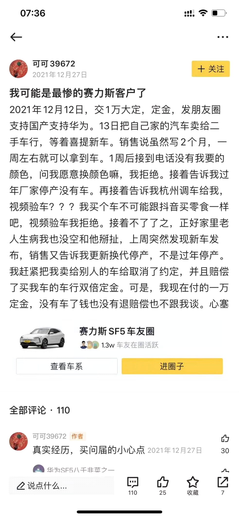 撤出了华为展厅之后的赛力斯SF5,仿佛就要回到当年那默默无闻的“平淡生活”中了,但事情却并没有那么简单。从网络上得到的信息来看,赛力斯SF5目前似乎处于停产状态,自称在2021年12月刚定了车的准车主是这么说的: