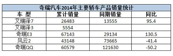 统计数据显示,2014年奇瑞集团汽车累计销量达494,824辆,其中,狭义乘用车销量为460,504辆,在国内乘用车企业中排在第13位,在自主品牌企业中位列第三位,较2013年的排名上升了一位。