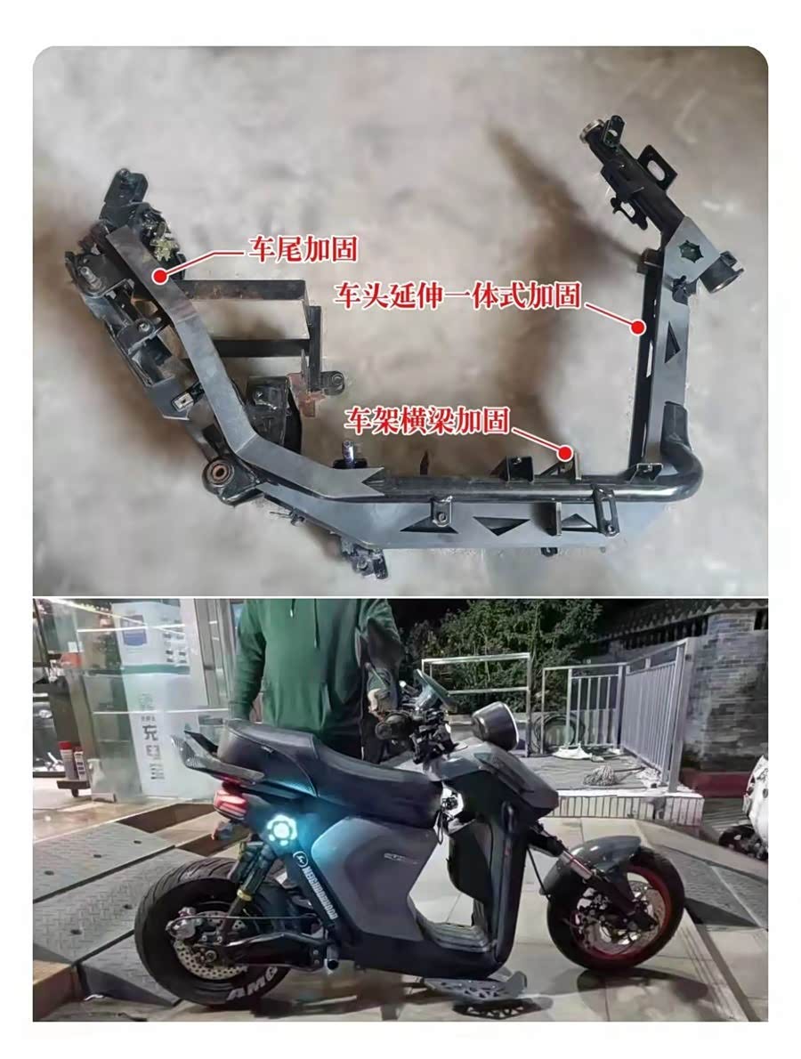 对于这些人群,新国标再怎么改,其车架也是不堪一击的弱点,毕竟整车重量限制在了55公斤以内,厂家没有多少材料加强车架,或者说加强了车架,其他零件就没法安装了,装了就超重,所以车架肯定要缩水。为此,很多民间改装专家DIY了很多异想天开的改装件,比如加固车架大梁的配件,甚至还有加强的车架总成。