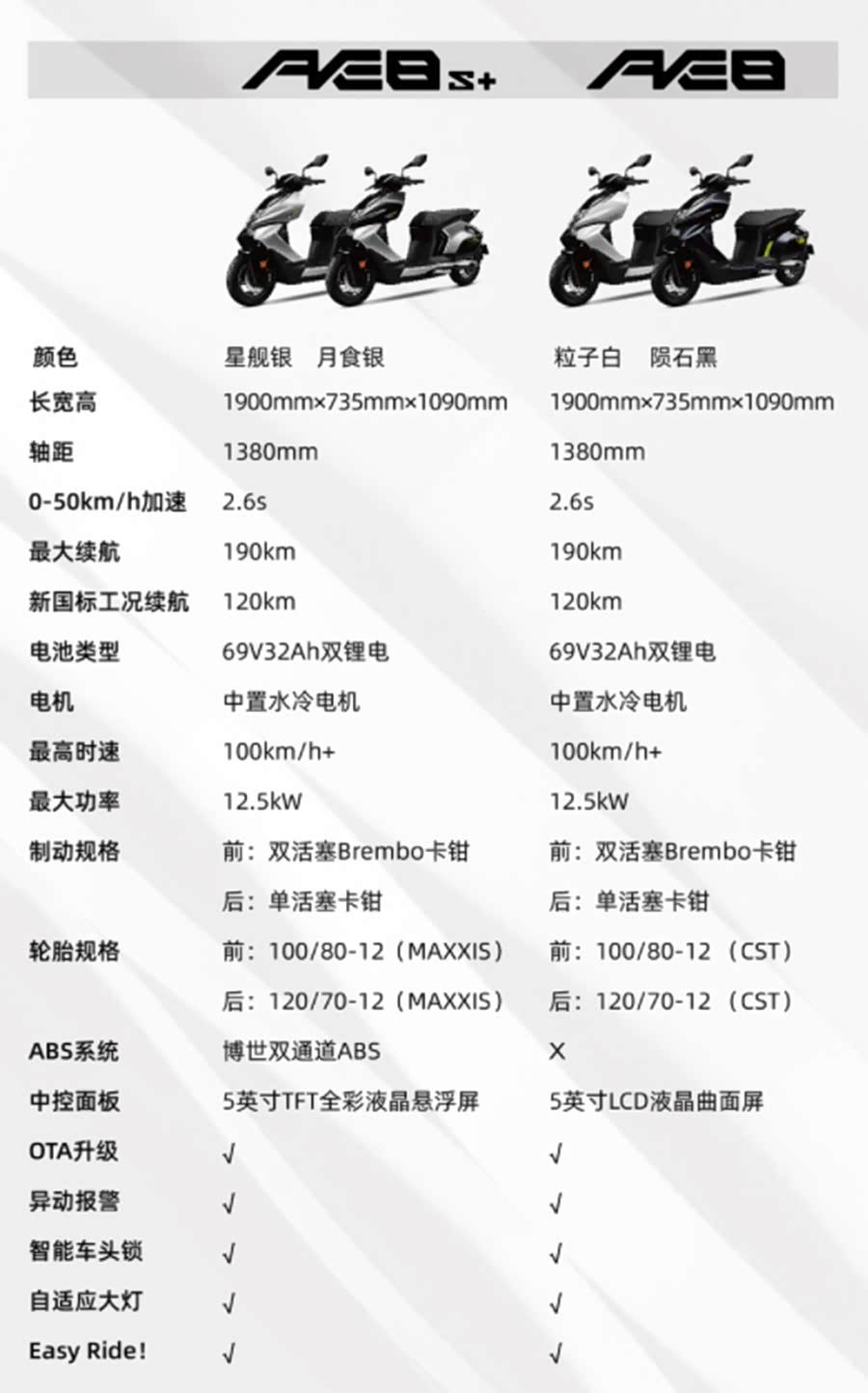 官方表示,AE8采用了大功率中置水冷电机,峰值功率12.5kW、轮上扭矩218N·m,使得该车拥有超越300cc燃油踏板的优越性能,0-50Km/h加速仅需2.6s,极速100km/h+。搭配69V32Ah汽车级高性能软包电池组新国标工况续航里程可达120km,可换电、双锂电电池组快充设计,告别里程焦虑。另外还配备了双液压预载/多段阻尼可调后减震,MAXXIS半热熔轮胎,以及全系标配Brembo卡钳,同时搭载的Z Link极智™互联系统可实现OTA 远程升级。