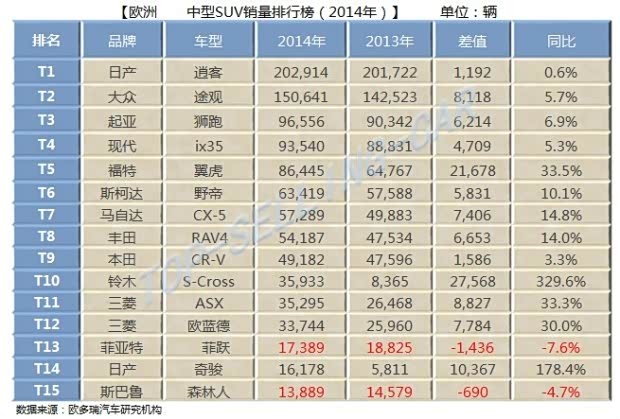 TOP1:日产逍客。年销量为202,914辆,仅笔2013年多卖了1192辆。这是日产在欧洲最成功的车型。其在中国的销量为8.74万辆。