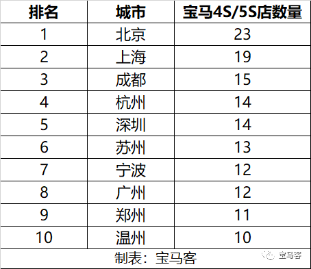 全中国宝马4S店最多的城市是:北京市,合计拥有23家宝马4S店.