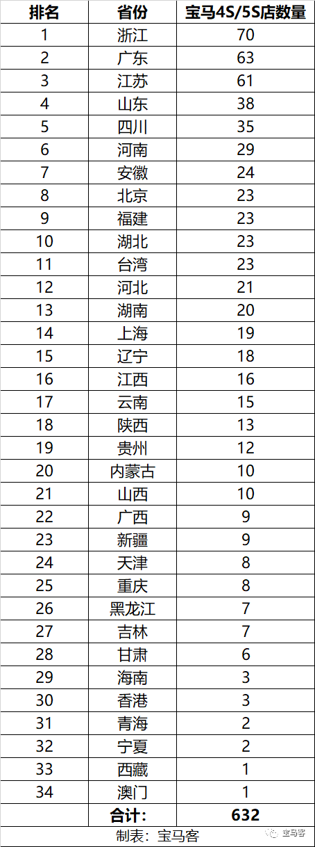 就是这总量排名最后的东南区,却拥有全国宝马4S店最多的省份:浙江省,一省拥有70家宝马4S店。