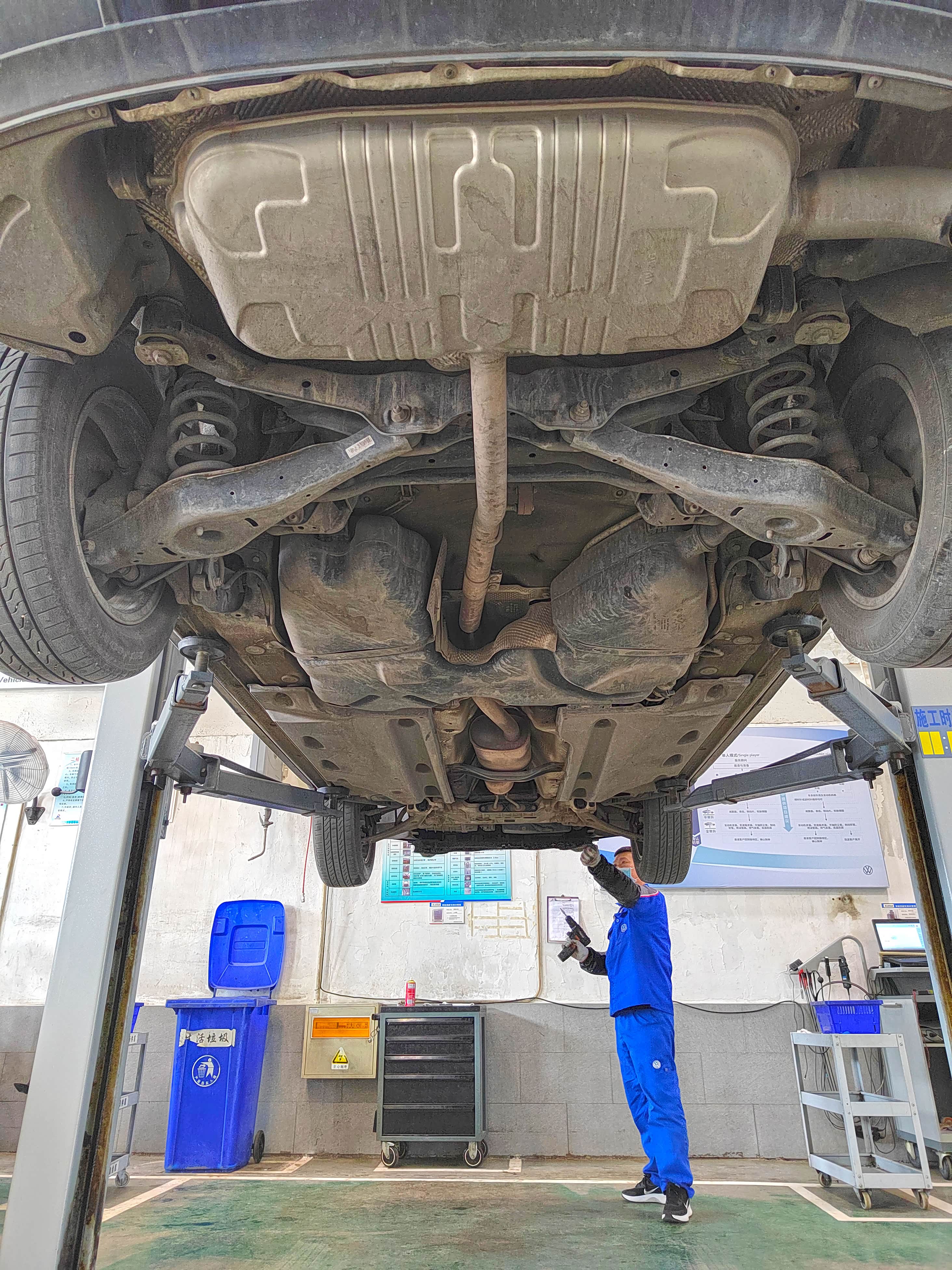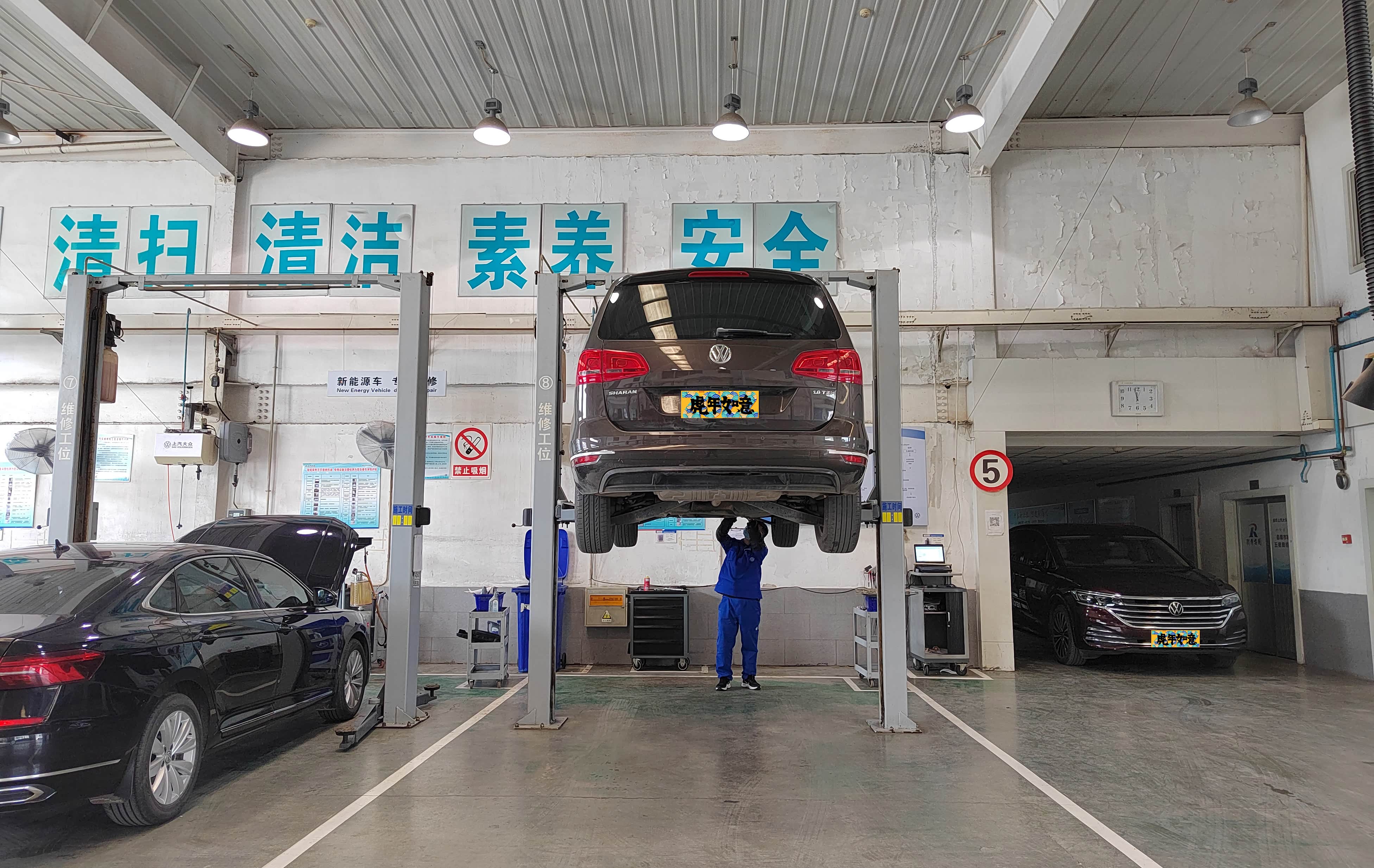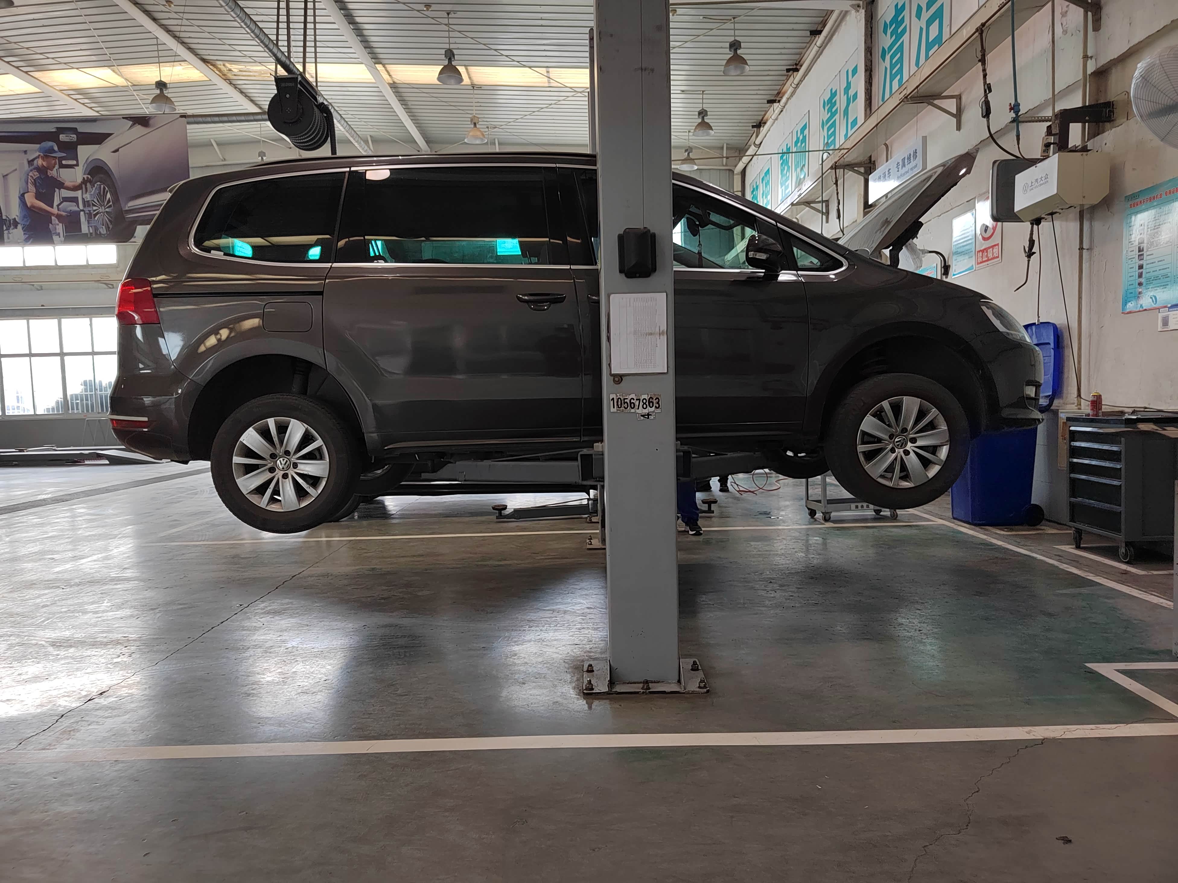 找了一家上汽大众4S店,这是把车开进售后开盖检查的状态,技师干活很讲究,举升机支腿已经准备好,此时我也心生疑问,换夏朗的发电机皮带需要升起来吗?