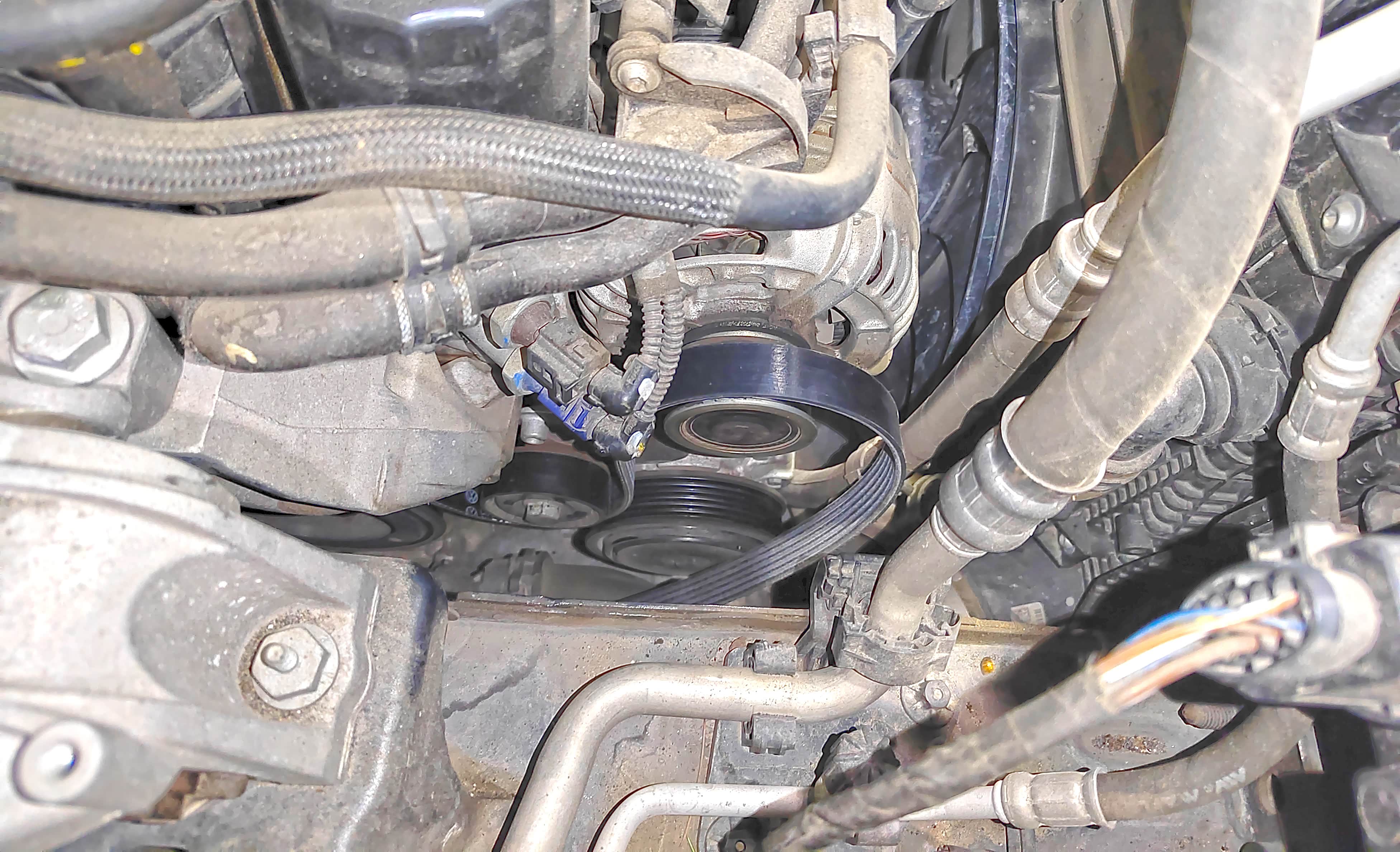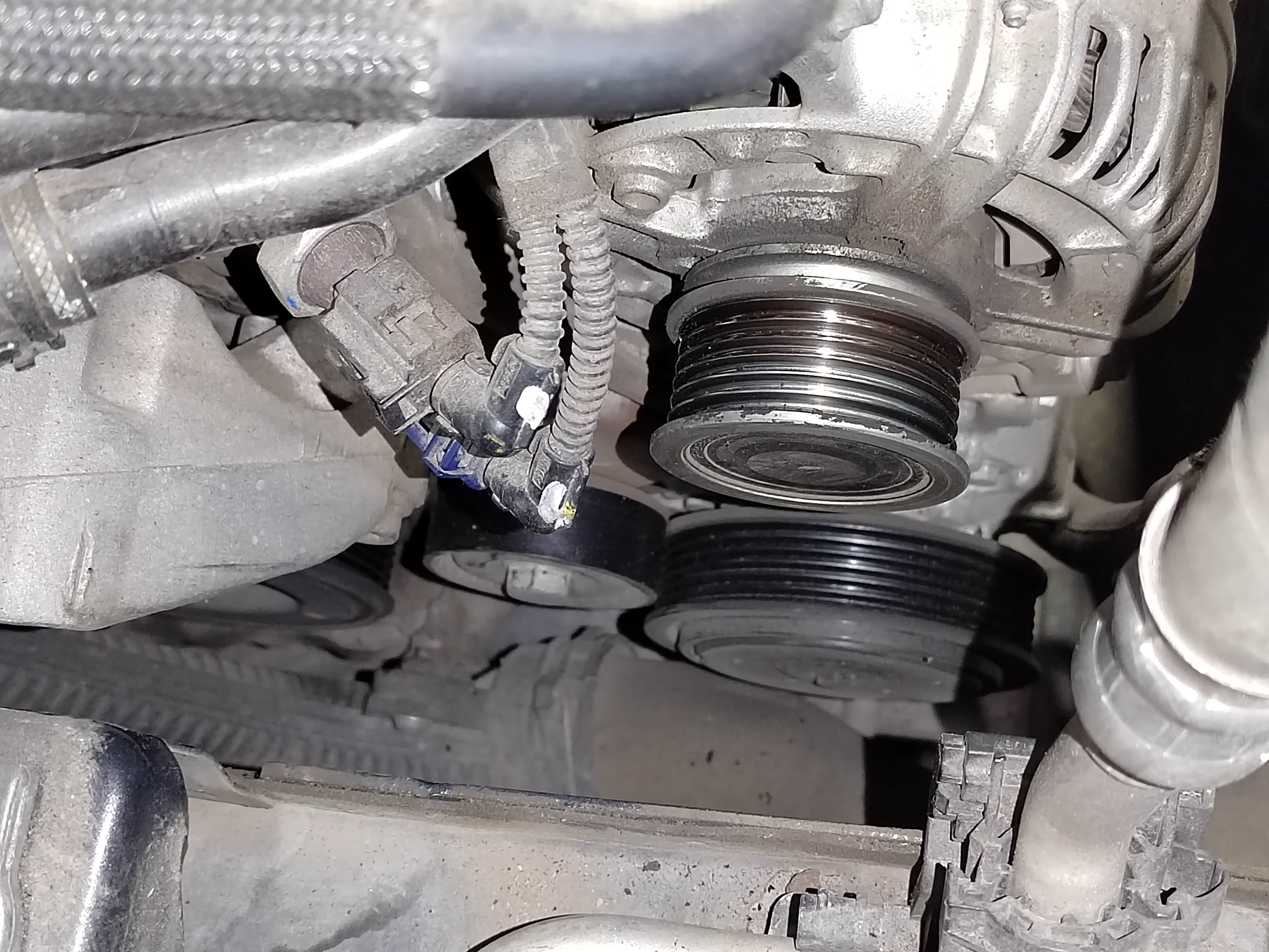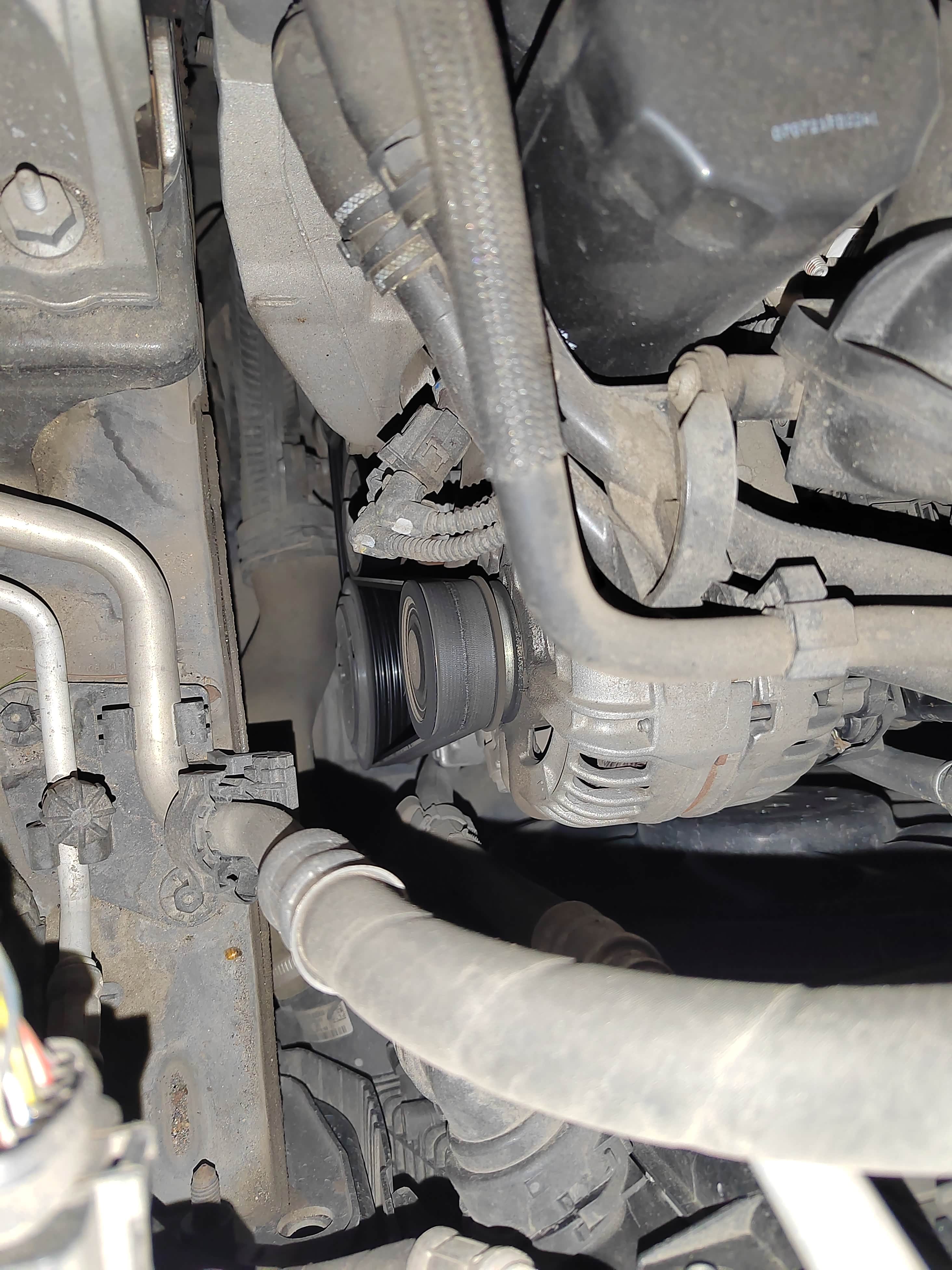 皮带的安装并没有想象的顺利,售后技师试探一番之后还是把车升了起来,拆掉发电机护板,伸进手去,在同时的齐心协力之下,才搞的,事后问师傅为何费劲,答曰这车老了,我心想,老师傅修老车,相互尊重吧。