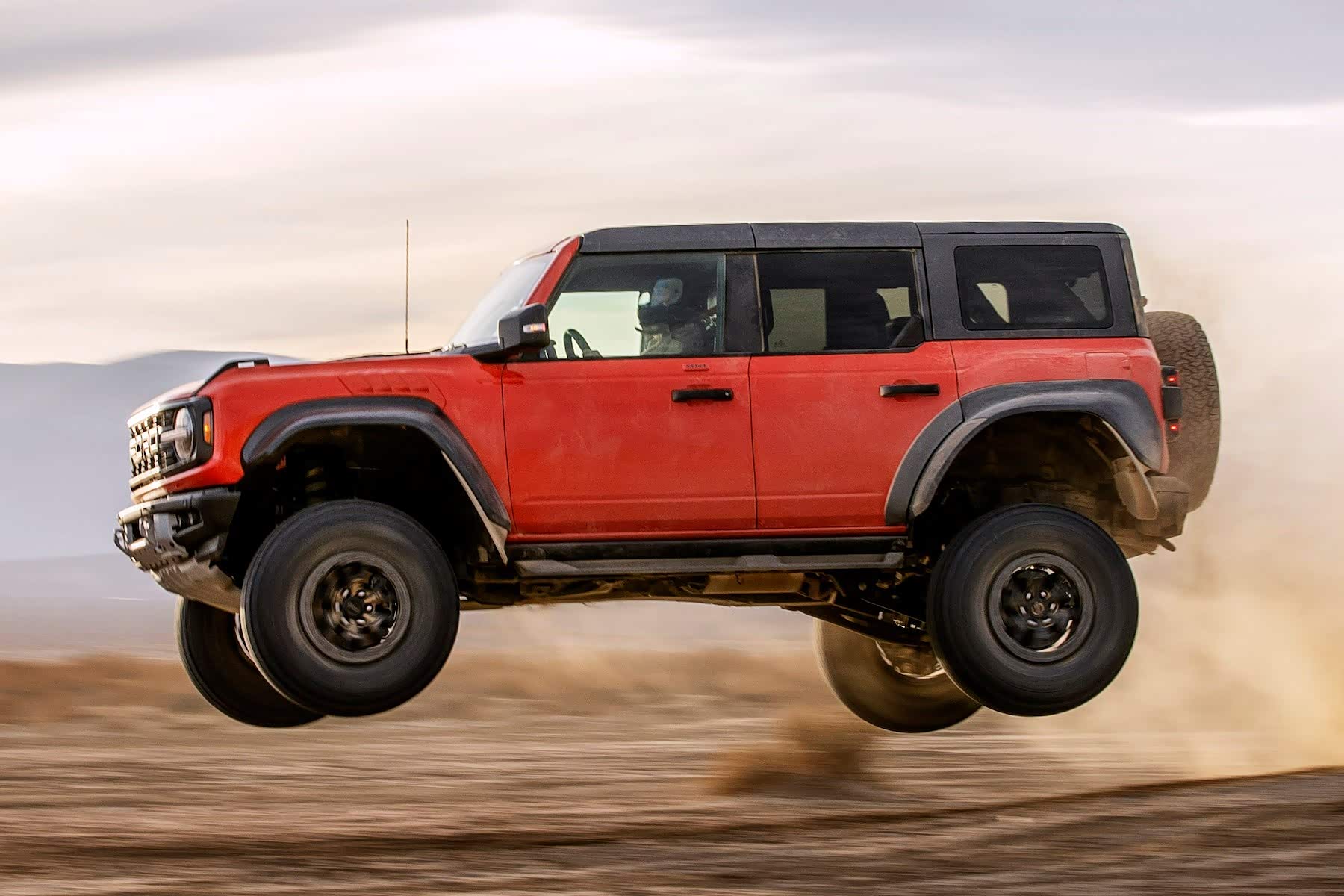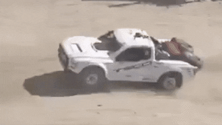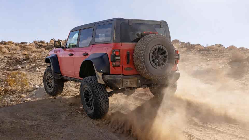 核心的高性能越野稳定悬架 (HOSS) 系统,这套系统由福特与避震制造商FOX合作,与F-150的位置敏感阻尼设计类似,HOSS 4.0集成了FOX 3.1内部旁路半主动阻尼器,在前后进行了不同的阻尼设定,车辆四个车轮附近的悬架高度传感器和力量传感器每秒独立监控地形条件数百次,自动调整悬架阻尼,让车身在高速越野中保持稳定,这是一项从baja赛车中衍生而来的技术,高速越野时的状态如下图。