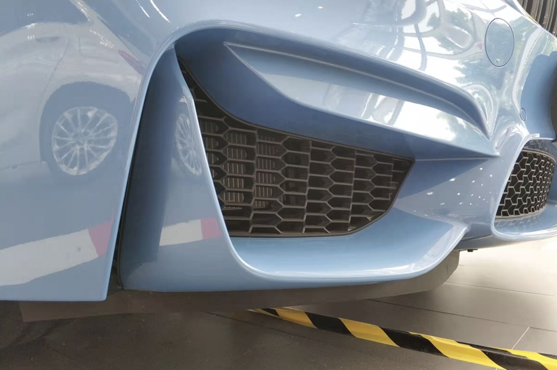 下包围为三段式镂空的设计,内部使用熏黑的蜂窝状网格填充,车头显得凹凸有致,赋予层次感和高颜值,整个风格风格激进而张扬。