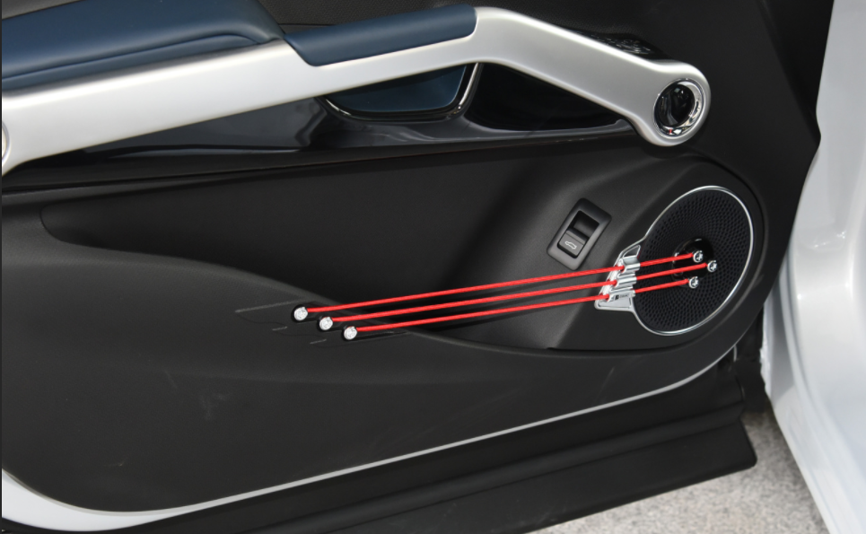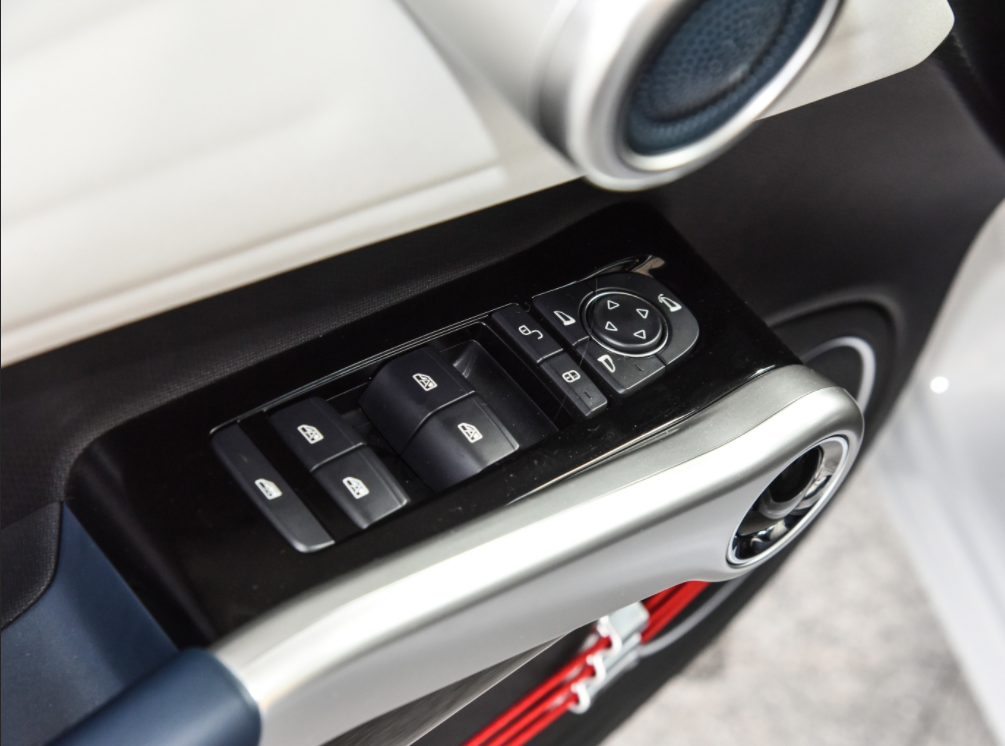 这个地方它是门的开关,我们现在是没锁车情况下它就打开了,如果说你是刚停车驻车情况下你要开门,因为车是锁的,锁第二下才能开门,下面这个是喇叭,然后喇叭我觉得没什么特色,喇叭上面它有一个蓝色的环。它是一个氛围灯,你在听音乐的时候,这个氛围灯能带给你很强的感觉。除此之外,在底下门把手这一块,握感还是十足的挺不错的。