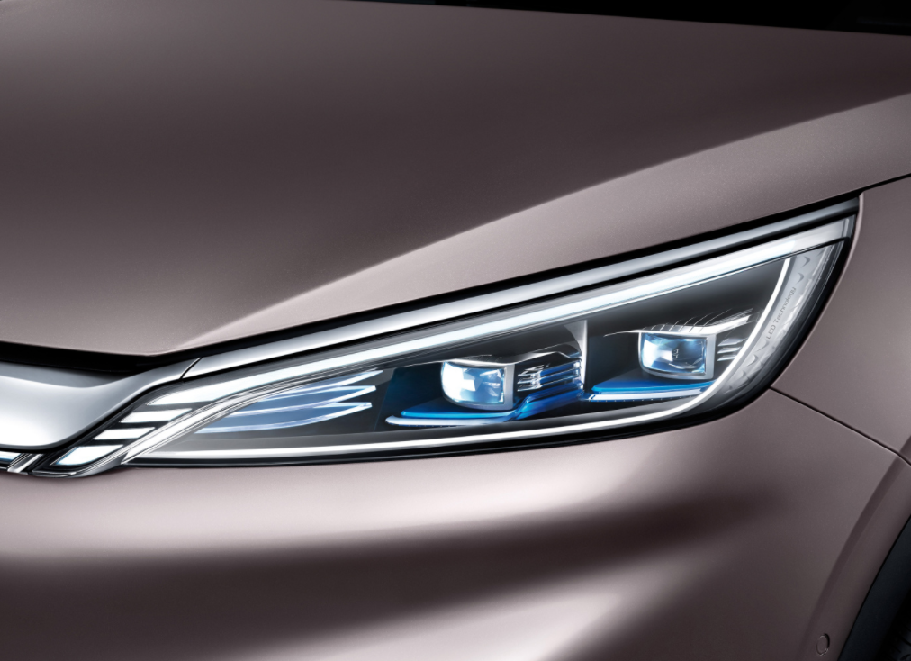 再可以看到它整个前脸圆润的线条,我们看两侧大灯,其实视觉上是很犀利的,但是这个线条又走得比较柔和。上面的LED日间行车灯的灯带,好像人的眉毛,但是这里有个阻断,视觉效果会让你看上去。更有立体感,再往里面灯源下面有这种蓝色的,会让你觉得这是不是一个激光大灯。