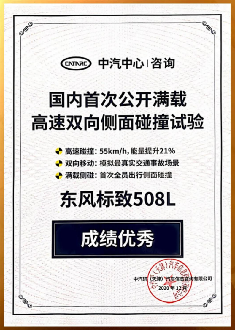 毕竟,在一年多前,东风标致508L就已经在天津中国汽车技术研究中心碰撞试验室成功挑战“国内首次公开满载高速双向侧面碰撞试验”,在这场整体难度创国内记录,超越了现行碰撞标准的试验中得分率高达88.75%,现场评定成绩为优秀。